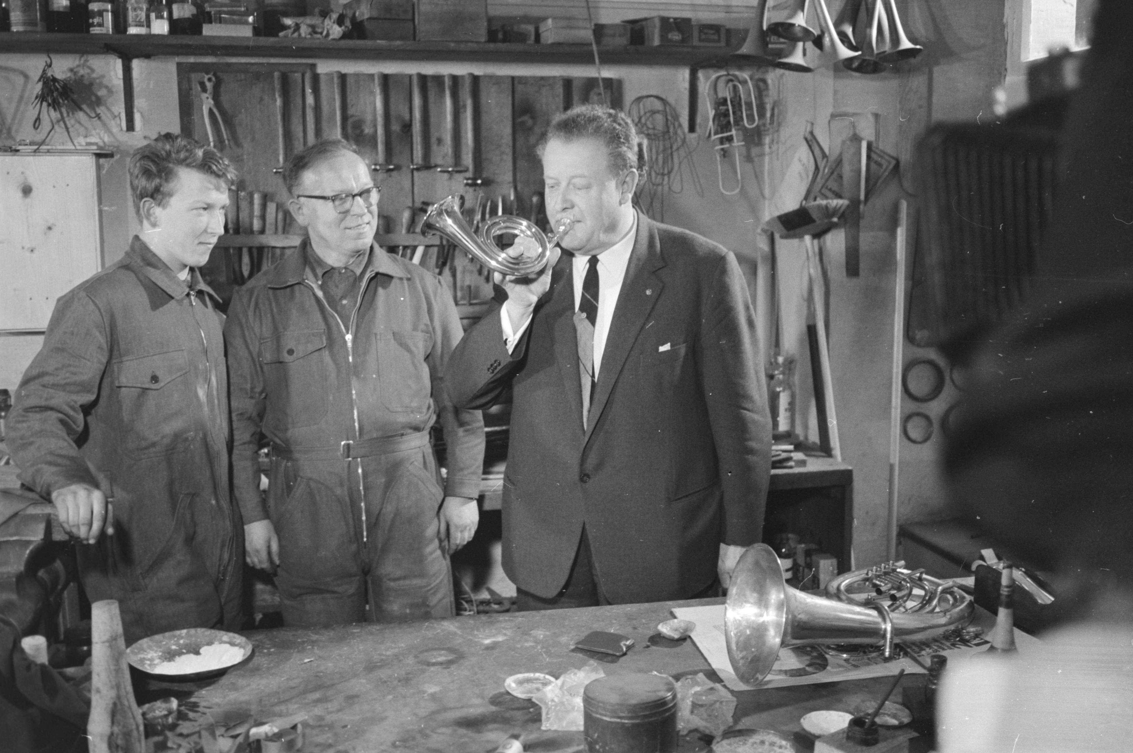 [34. Das Mundstück verfertigt Egger selbst. - Schliesslich bläst Paul Spörri das Posthorn an und prüft es.]