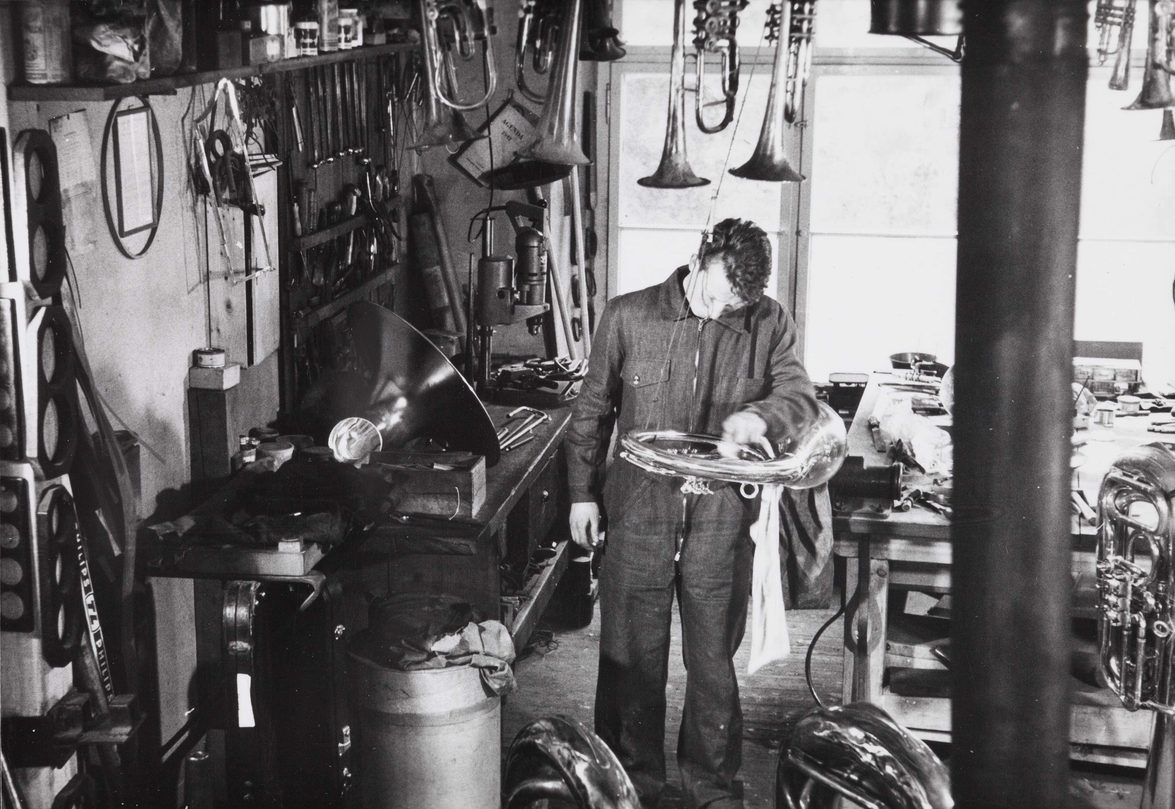 [Der Instrumentenmacher Adolf Egger in seiner Werkstätte am Klosterberg in Basel.]