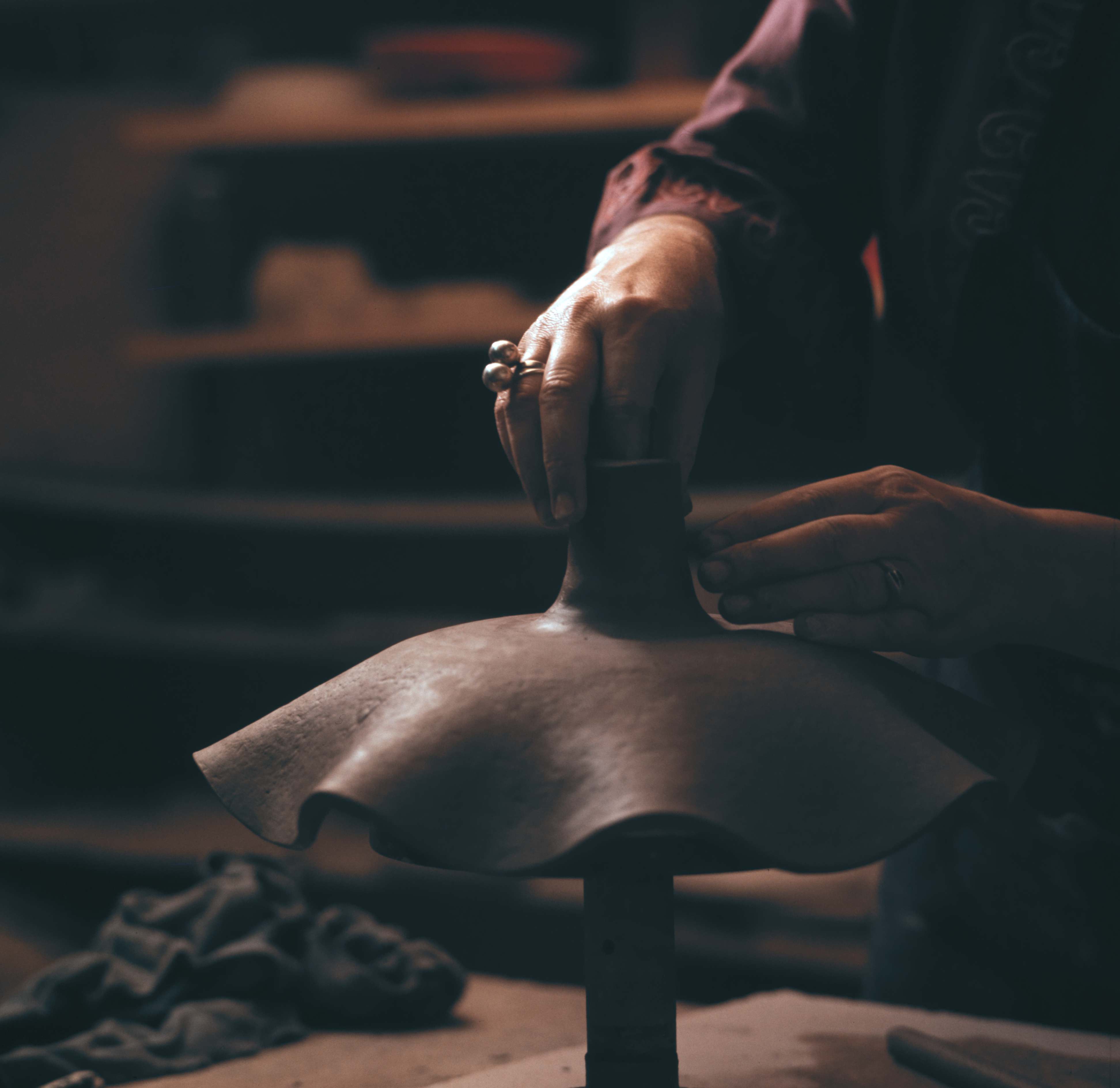 [Der geformte Ton wird von Töpferin Susa Messerli in die Form gedrückt]