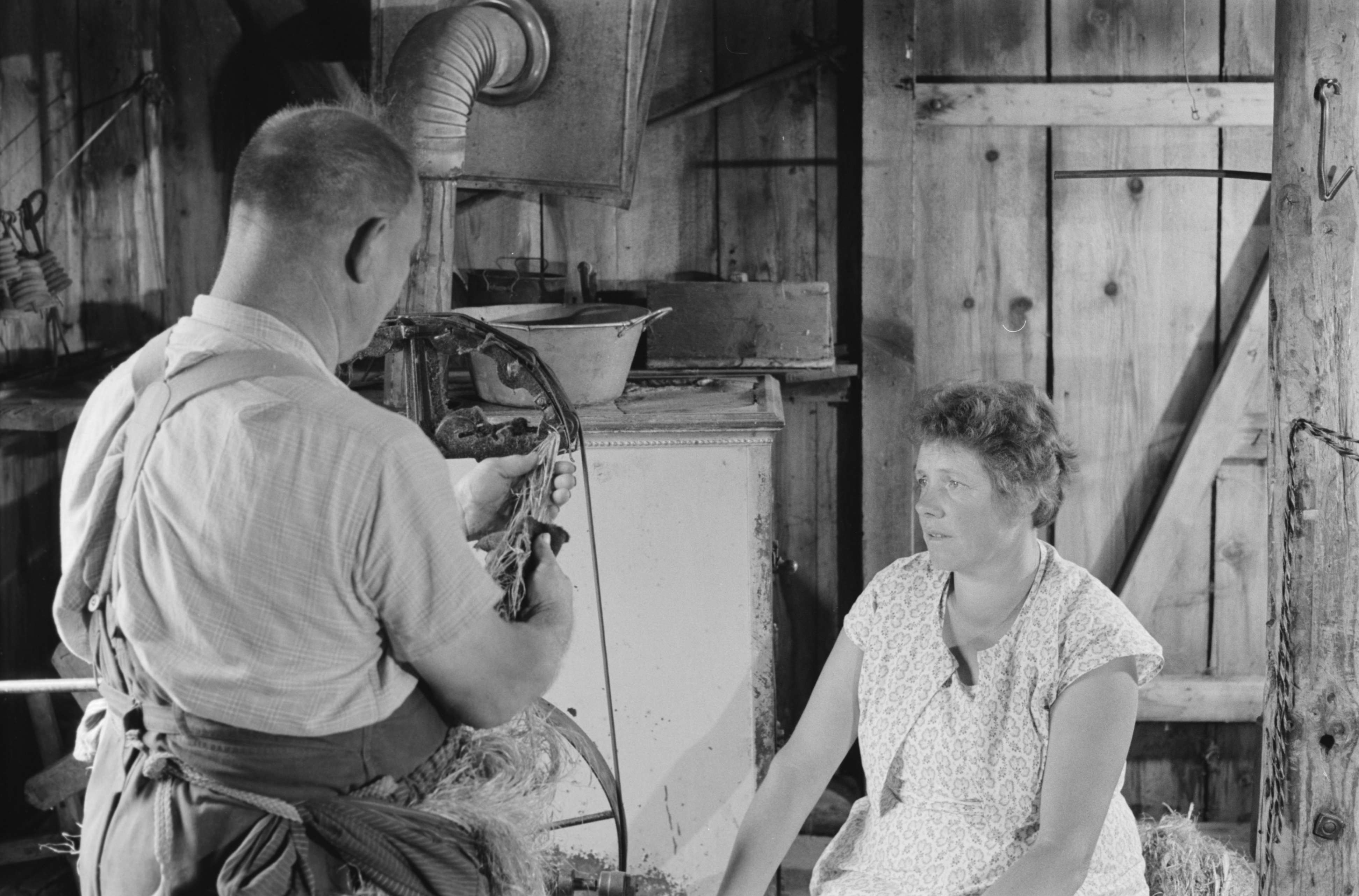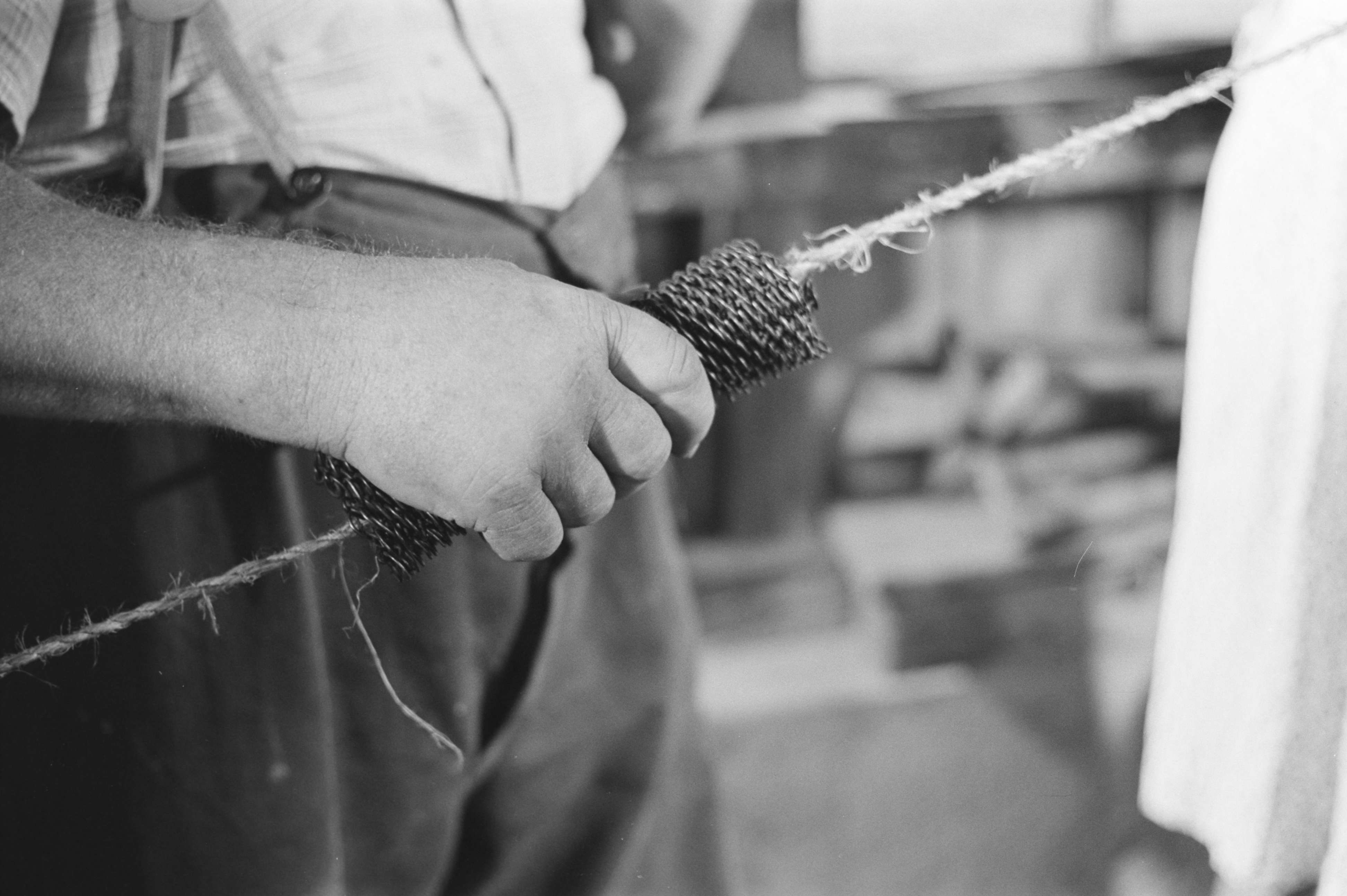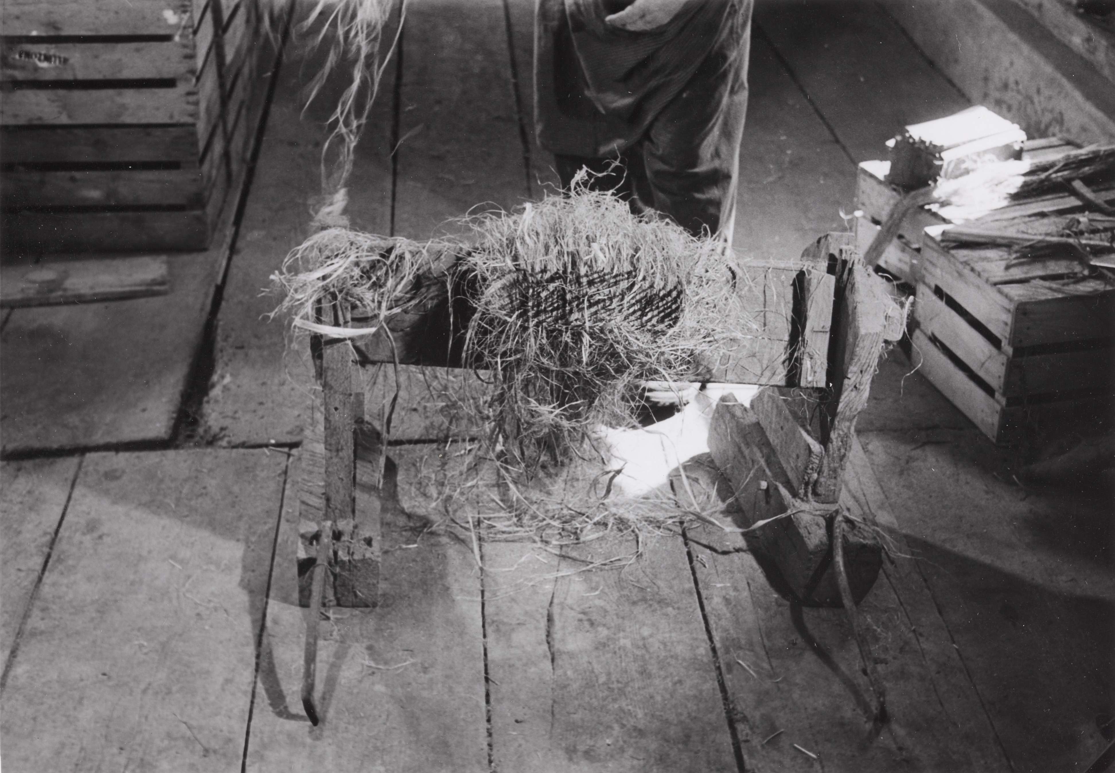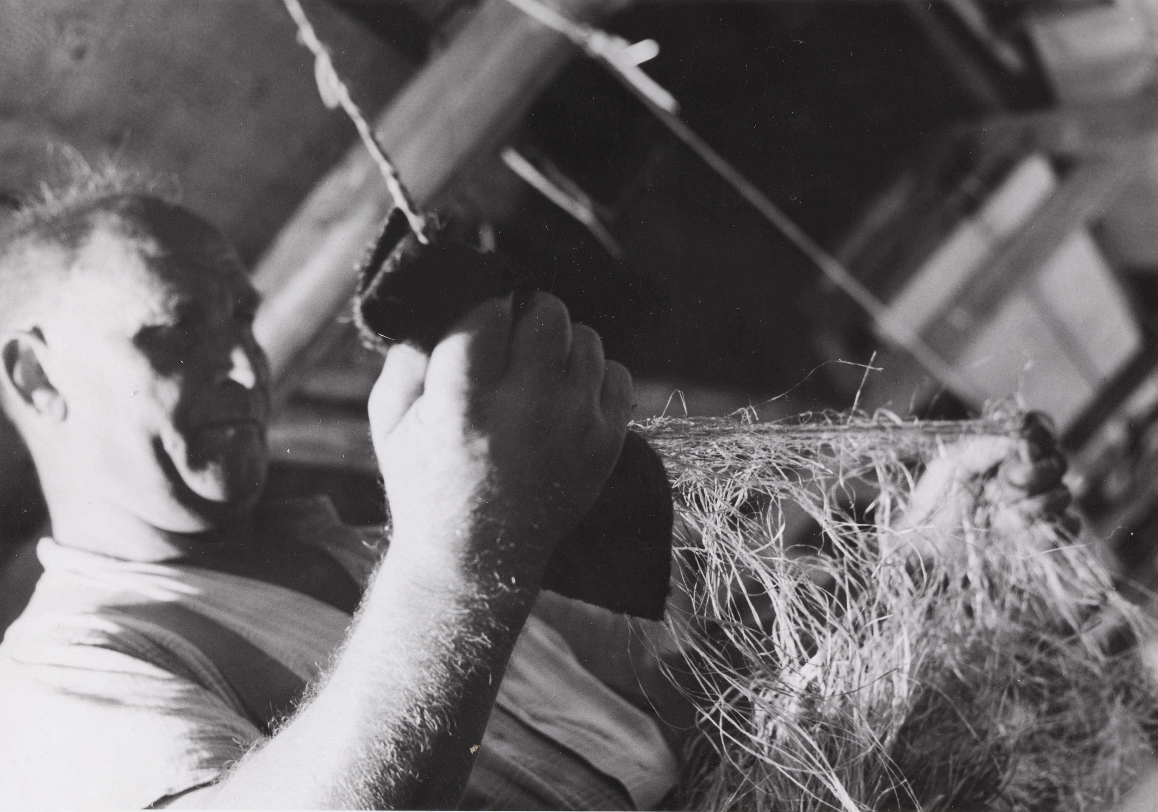 SGV_01P_01209HECHELN; 2. u. 3. Eine Puppe Rohhanf wird durch den Hechelkamm gezogen. Was nicht glatt ist, bleibt als kurzfaseriges 'Hechelnest' zurück.