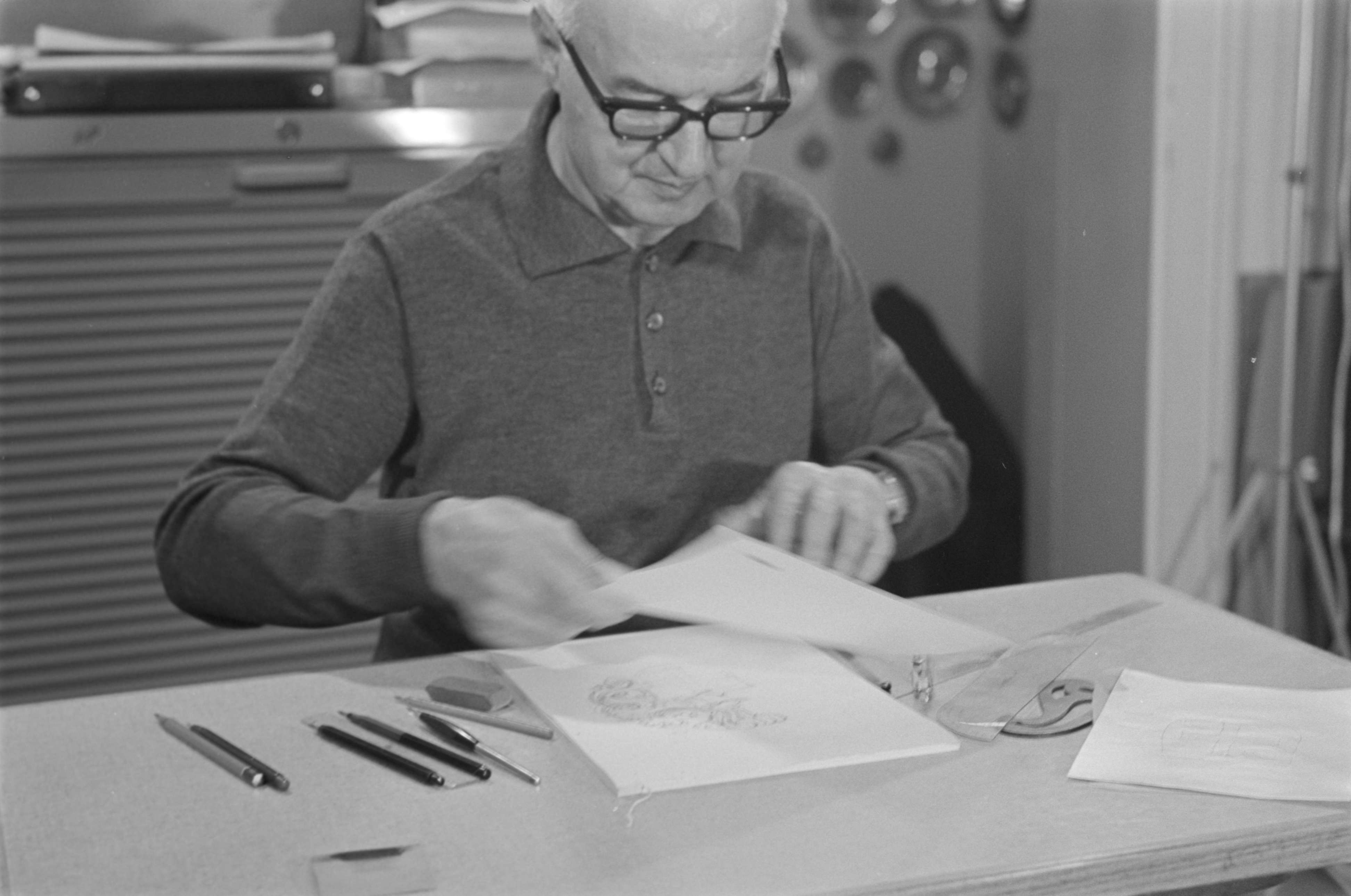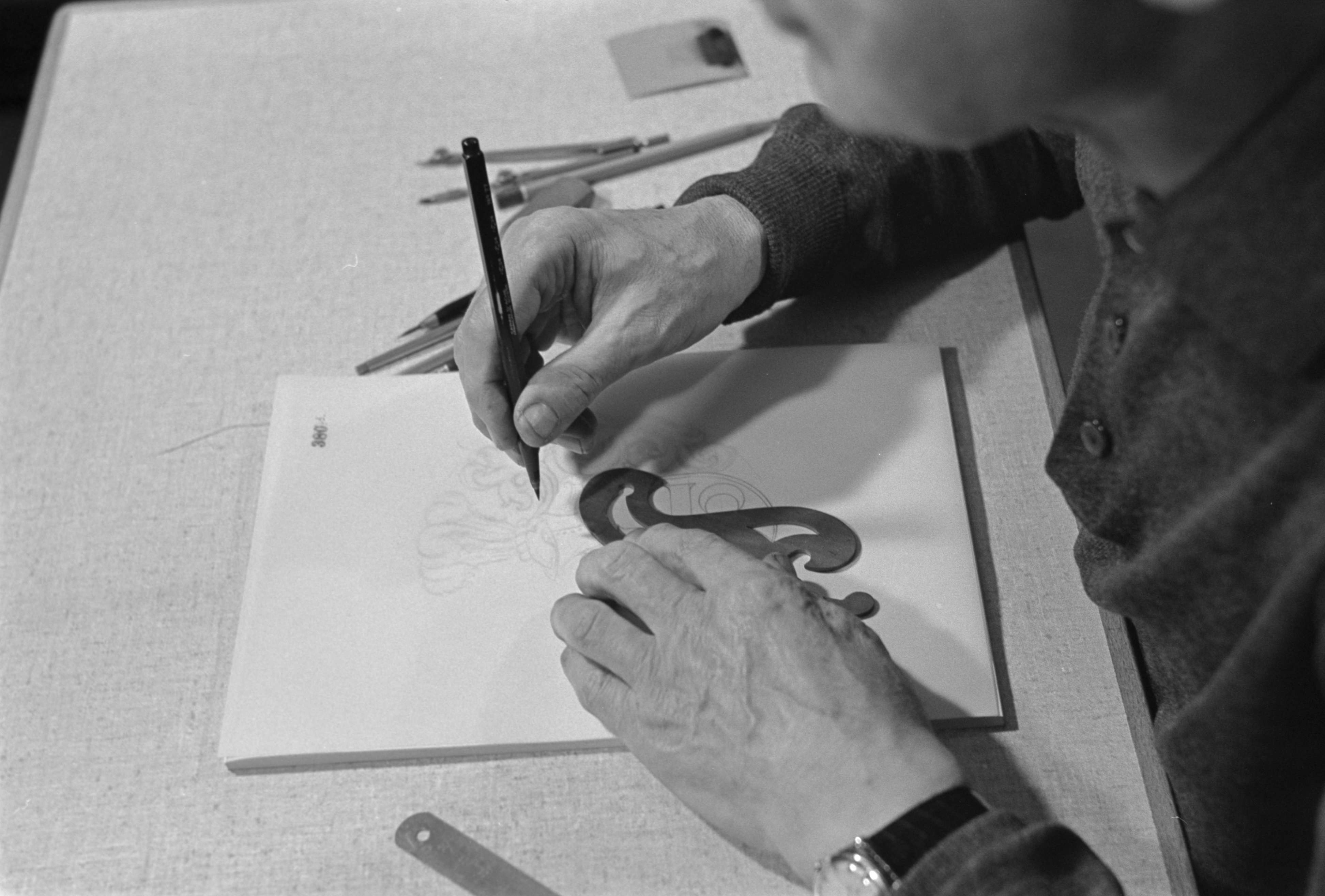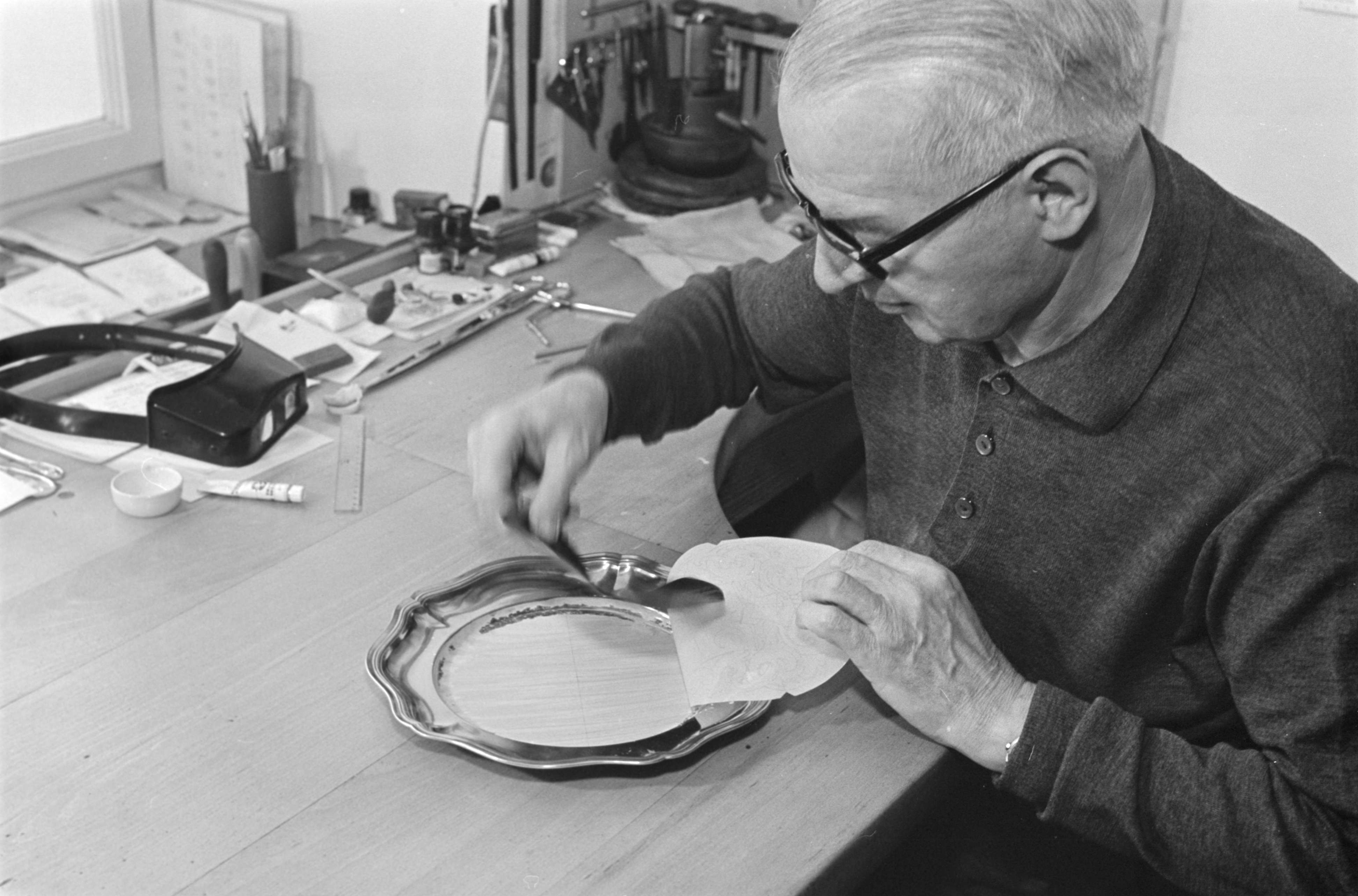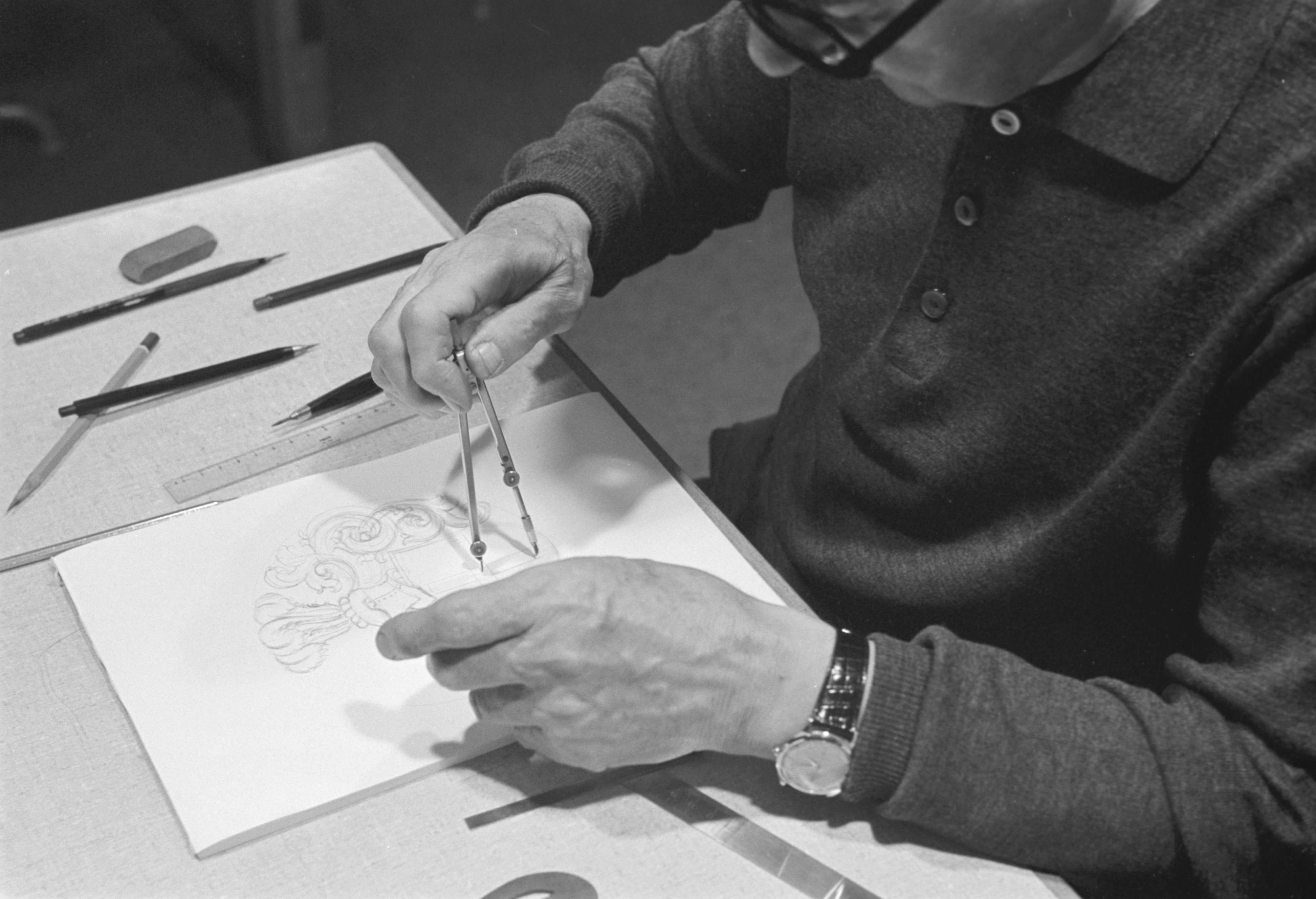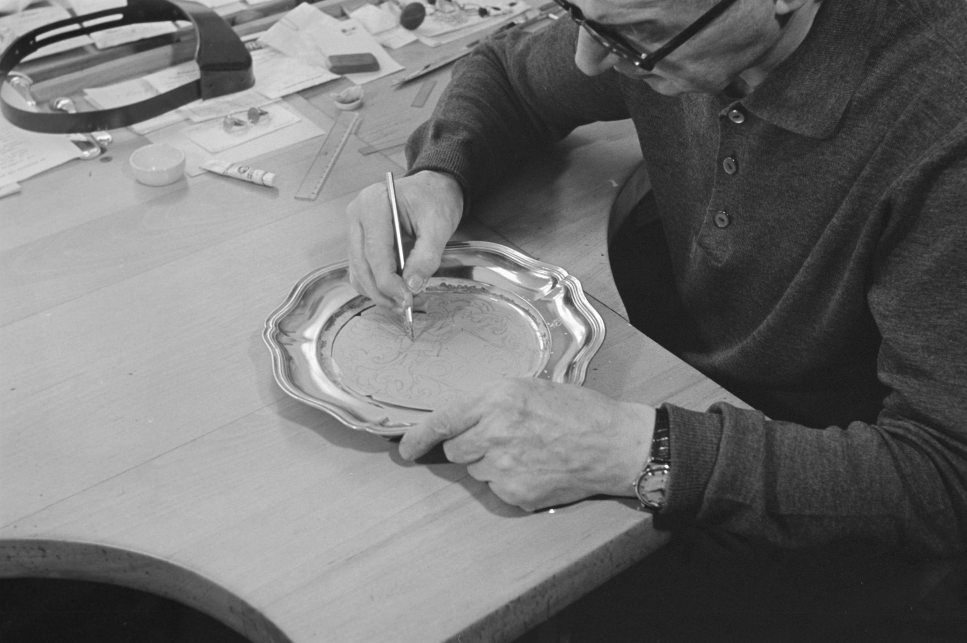 [Graveur, beim Zeichnen eines Gravur-Musters]