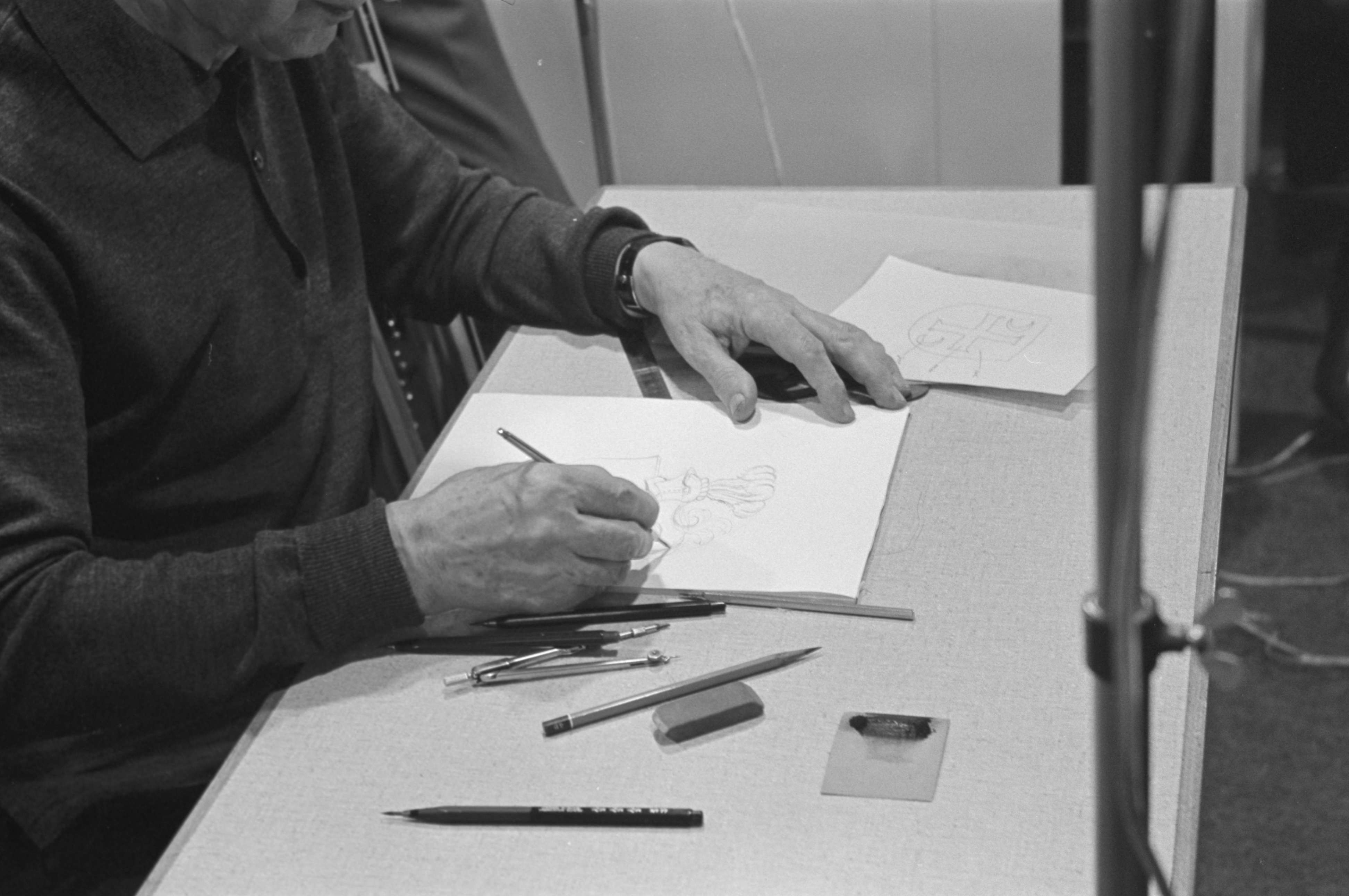 [Graveur, ein Gravur-Muster zeichnend]