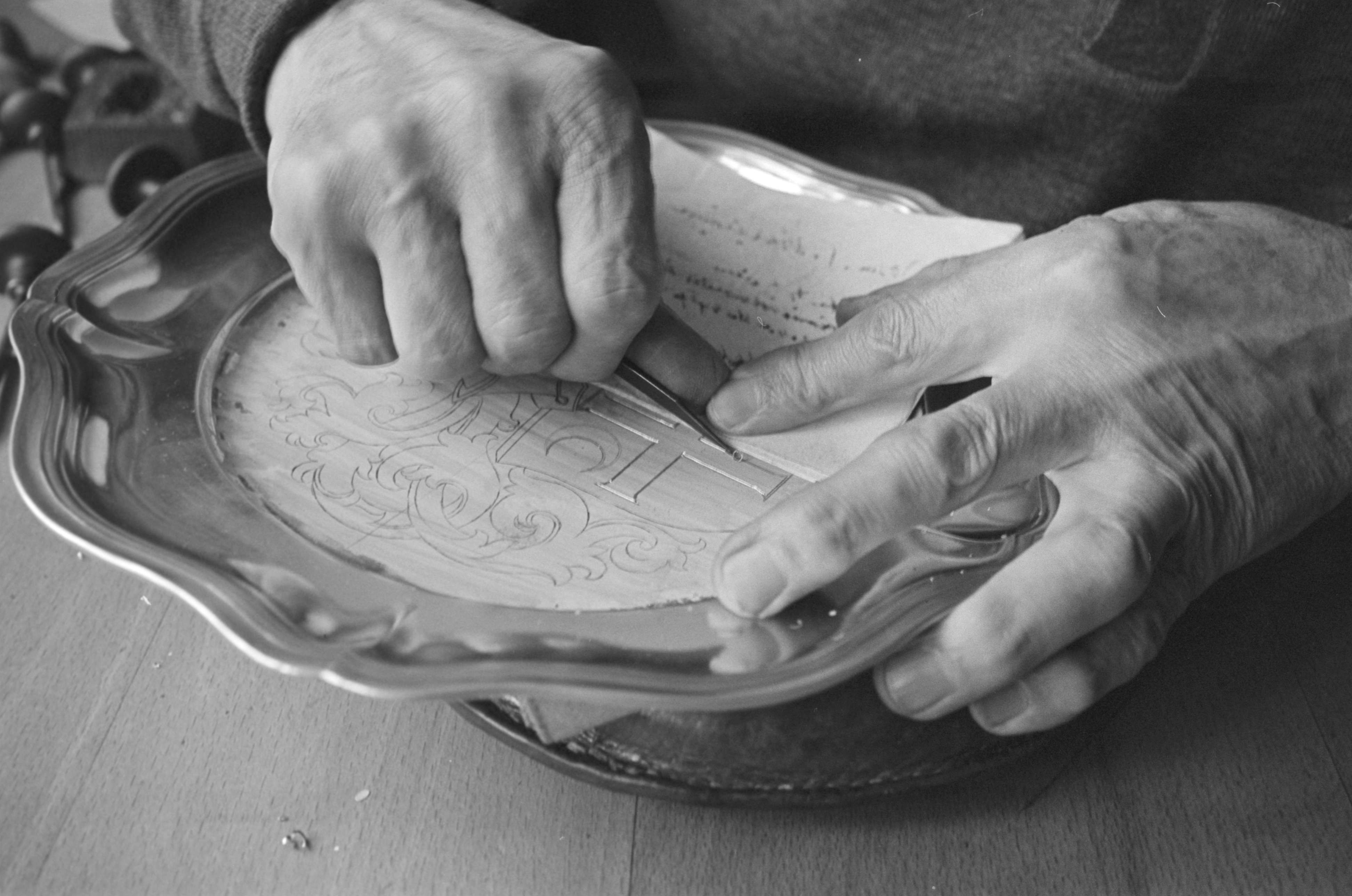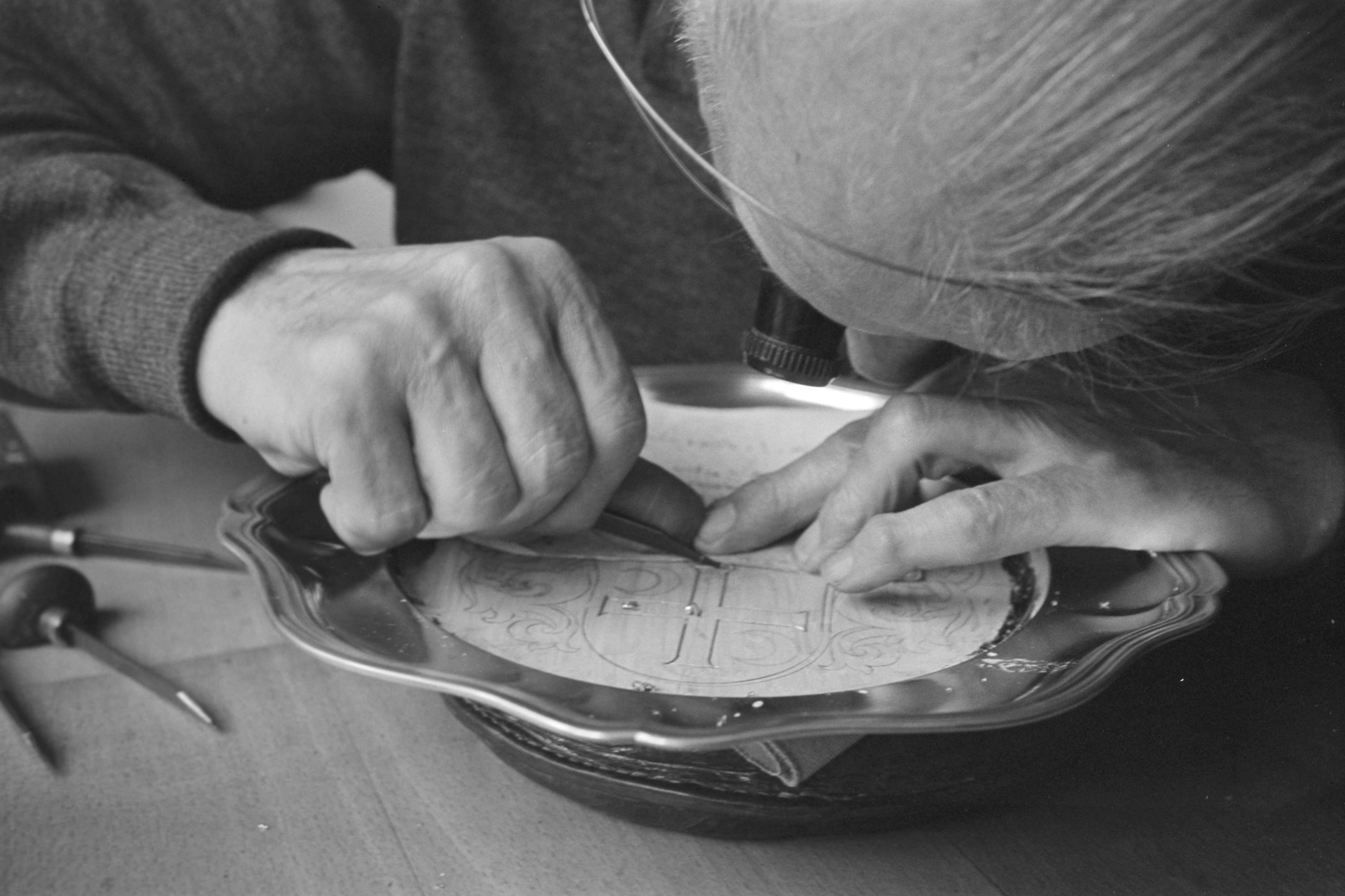 [Graveur, beim Zeichnen eines Gravur-Musters]
