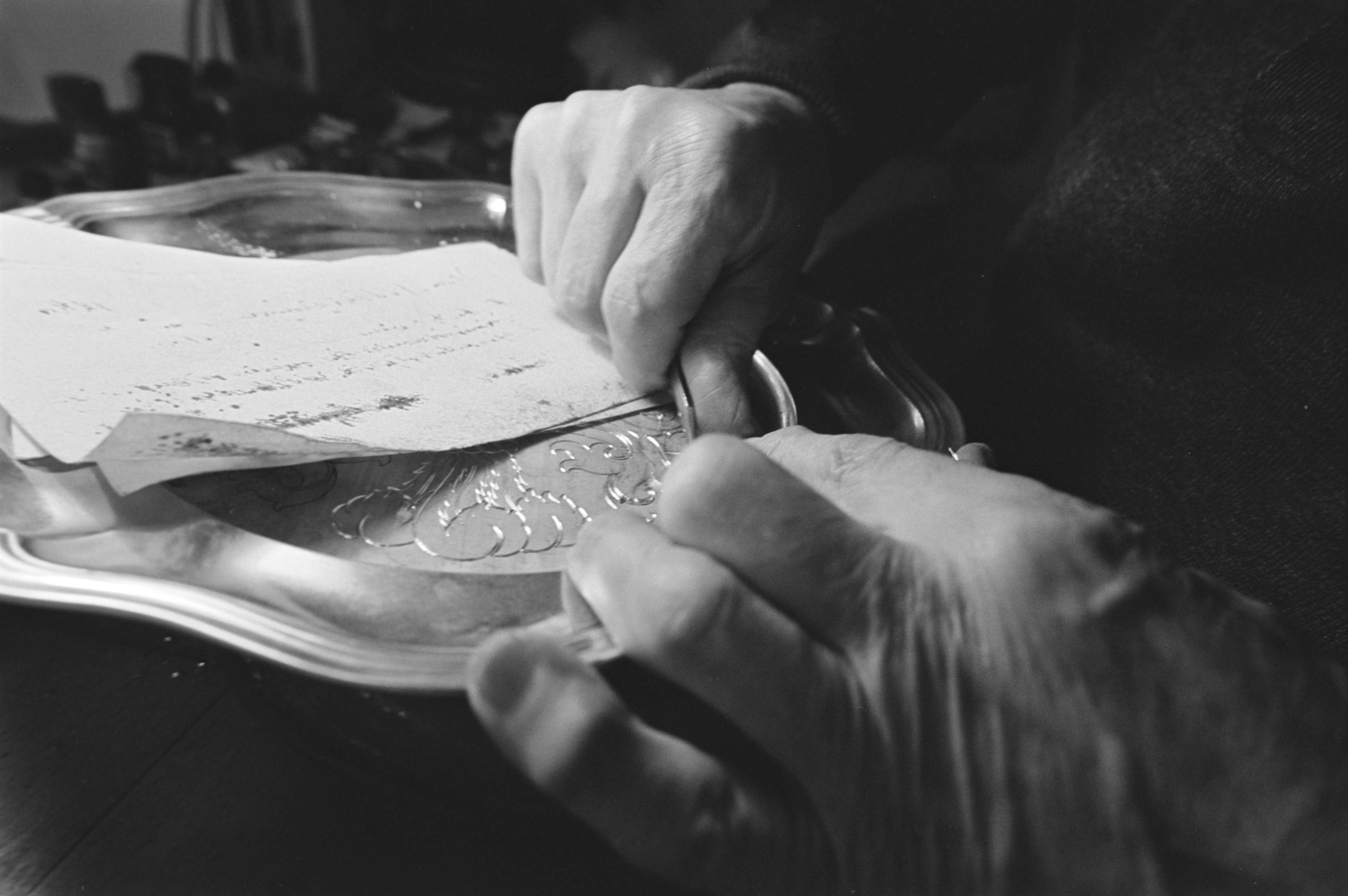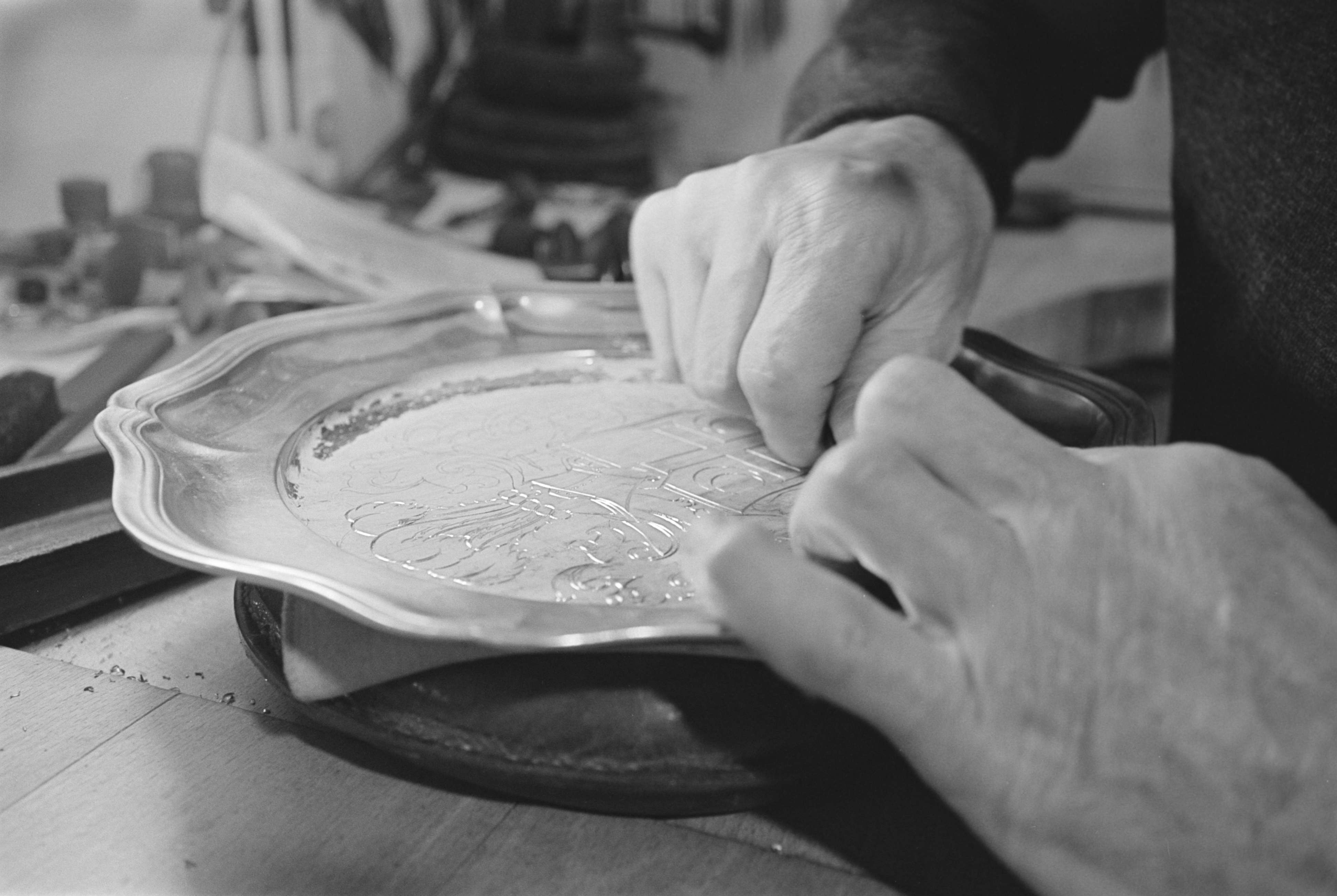 [Zinngraveur bei der Arbeit]