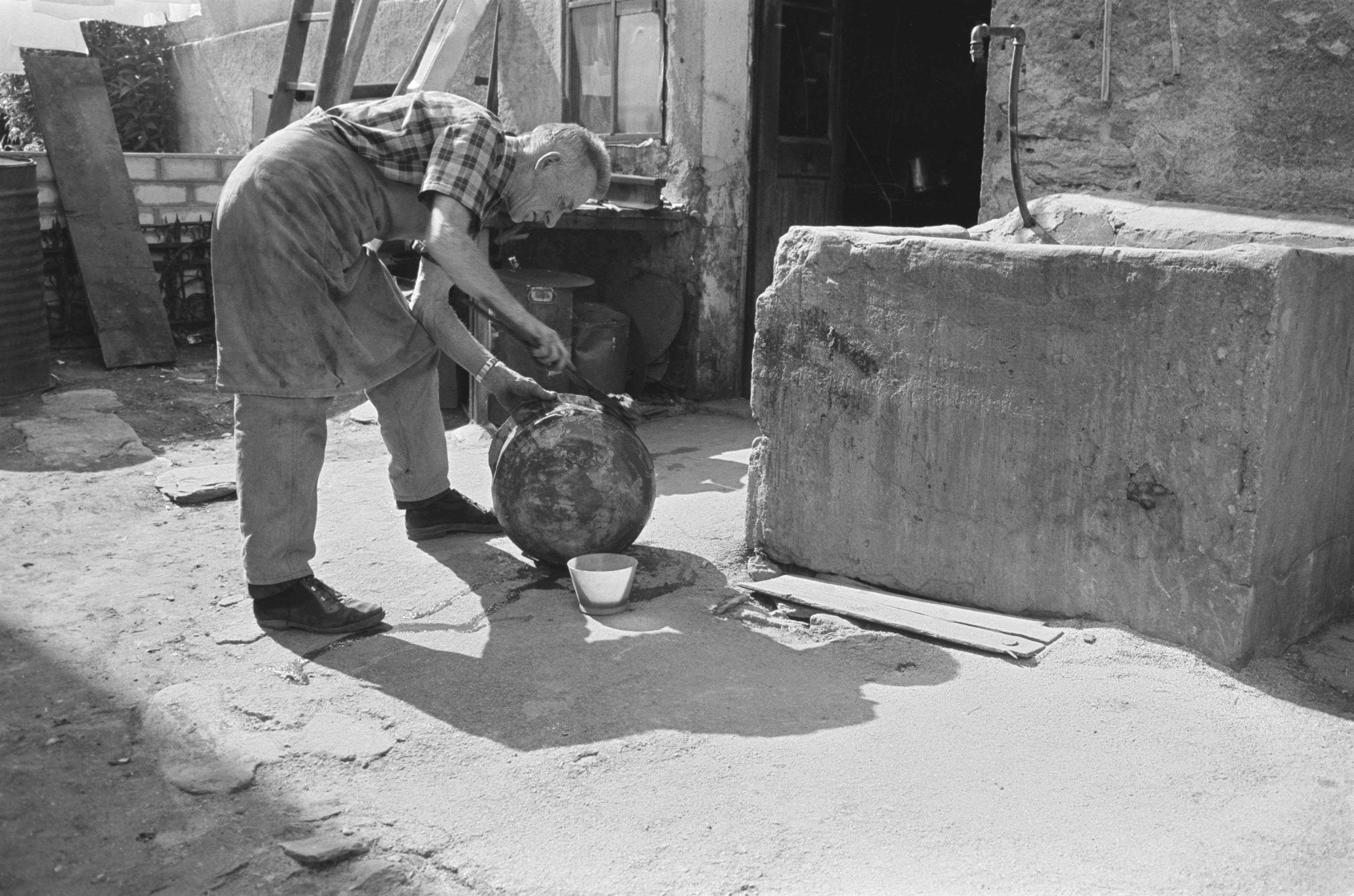 [Kupferschmied, erhitzt einen Kupferkessel]