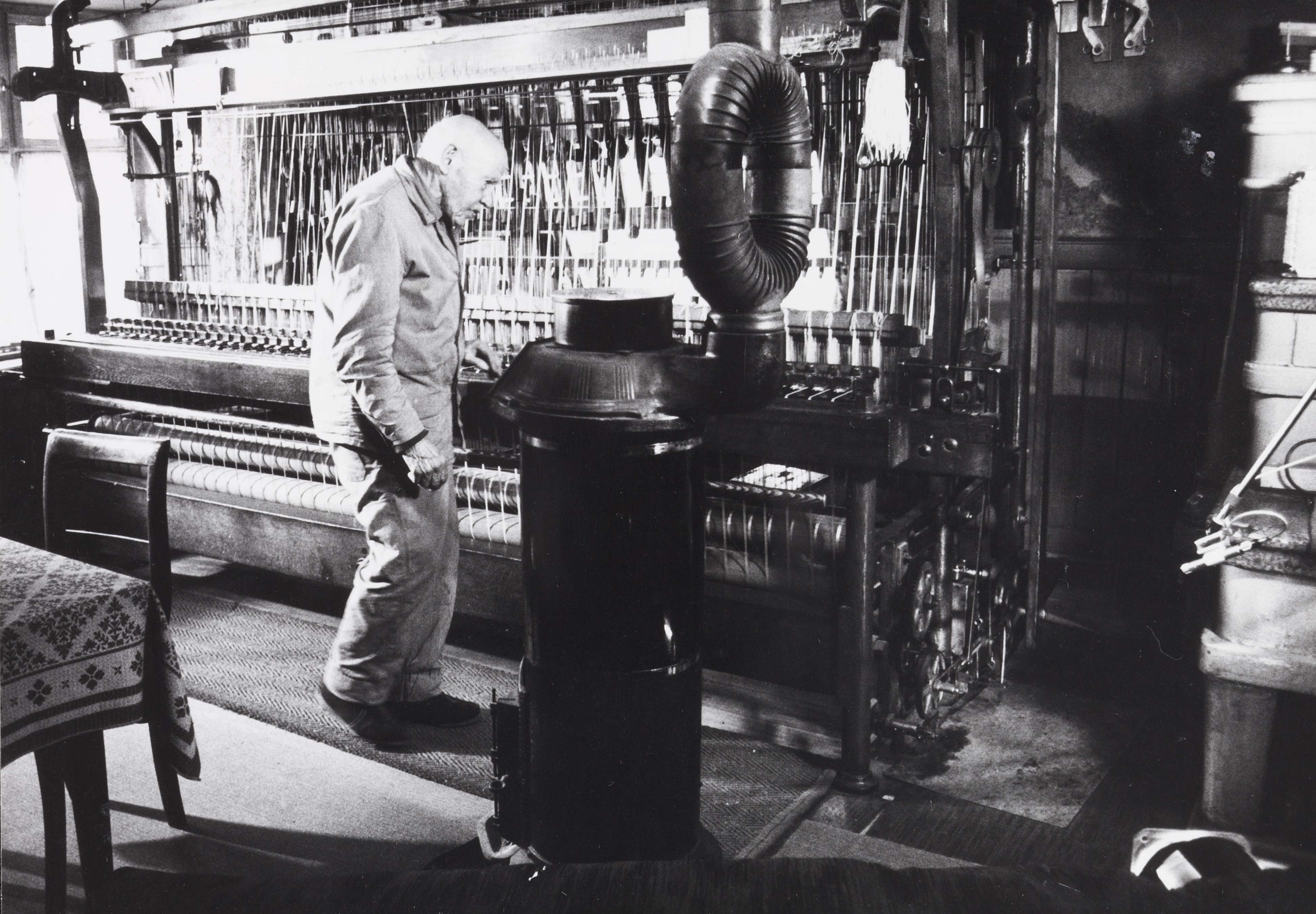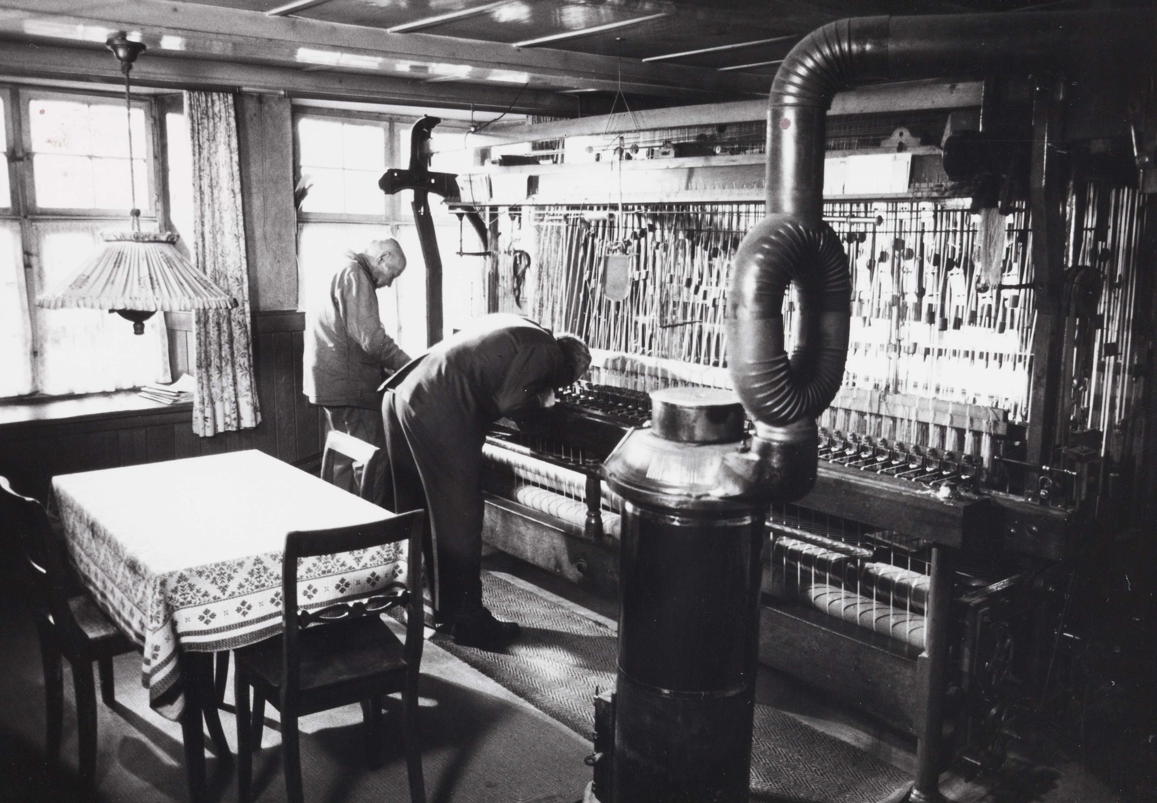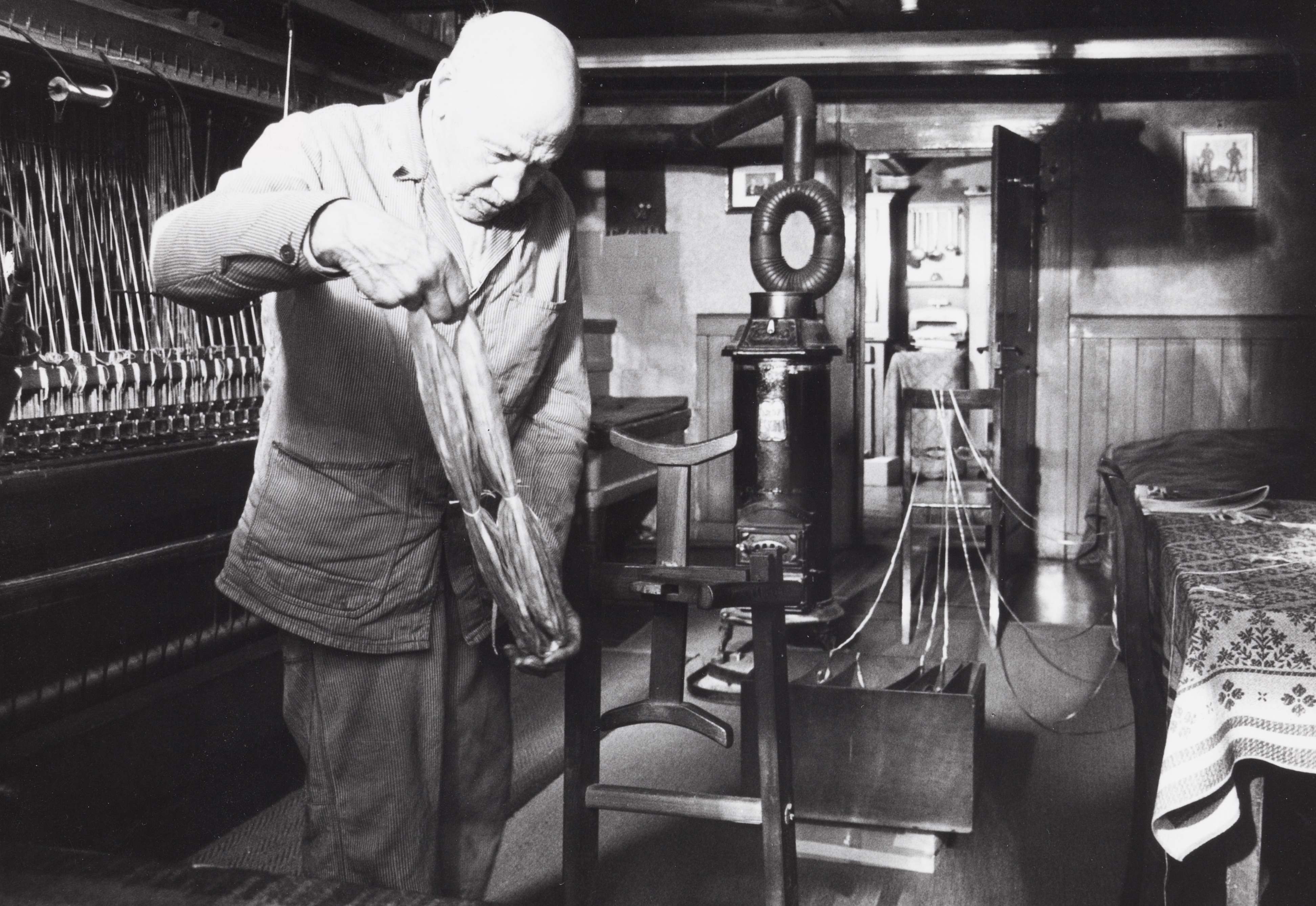SGV_01P_02820Ernst Walliser bei der Kontrolle einer Strange fertiger schmaler Bänder, die mit Querfäden gesichert ist. Vor dem Ofen Bändelhaspel und Bändelkarton. Reigoldwil 1973.