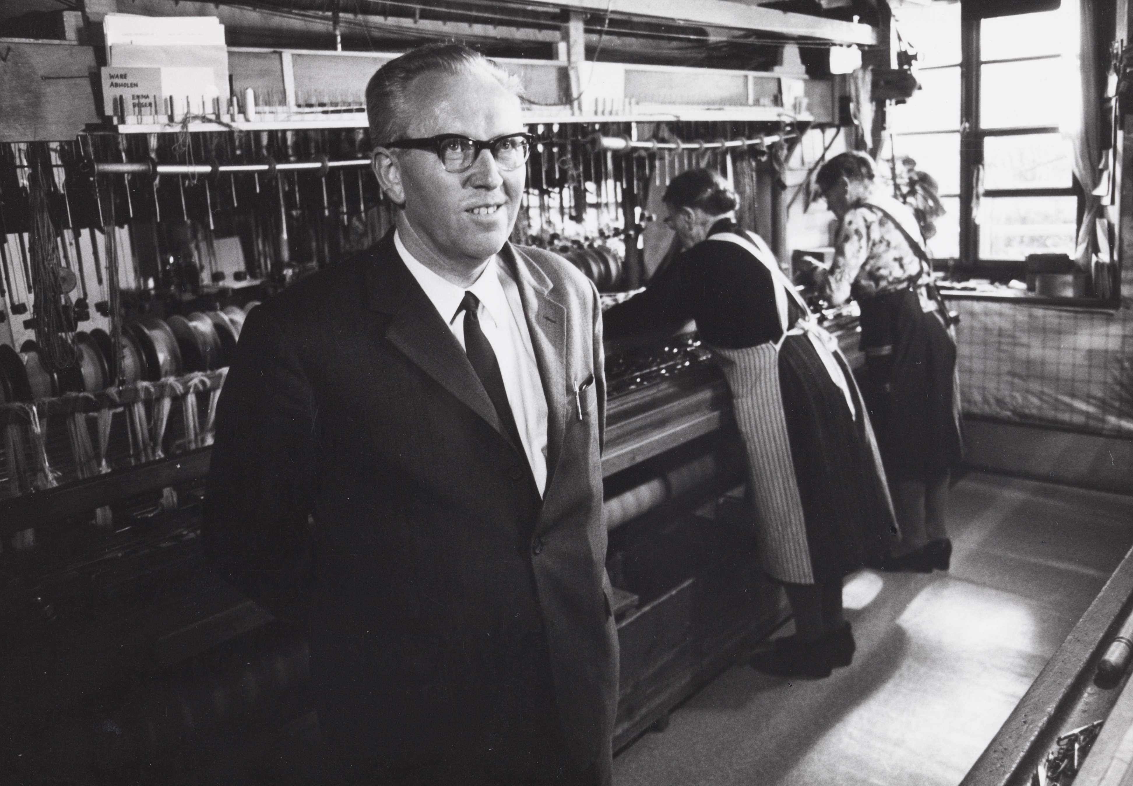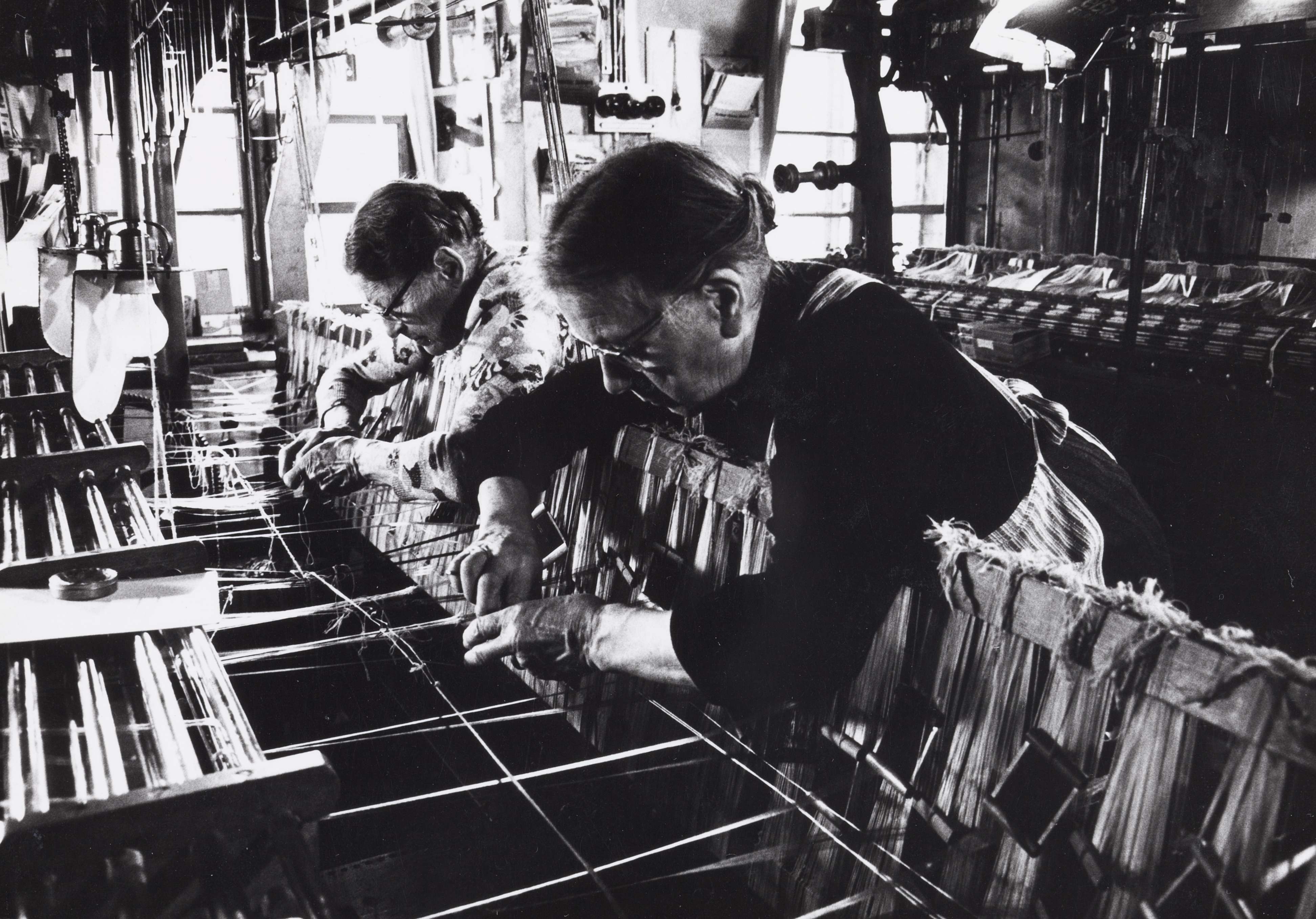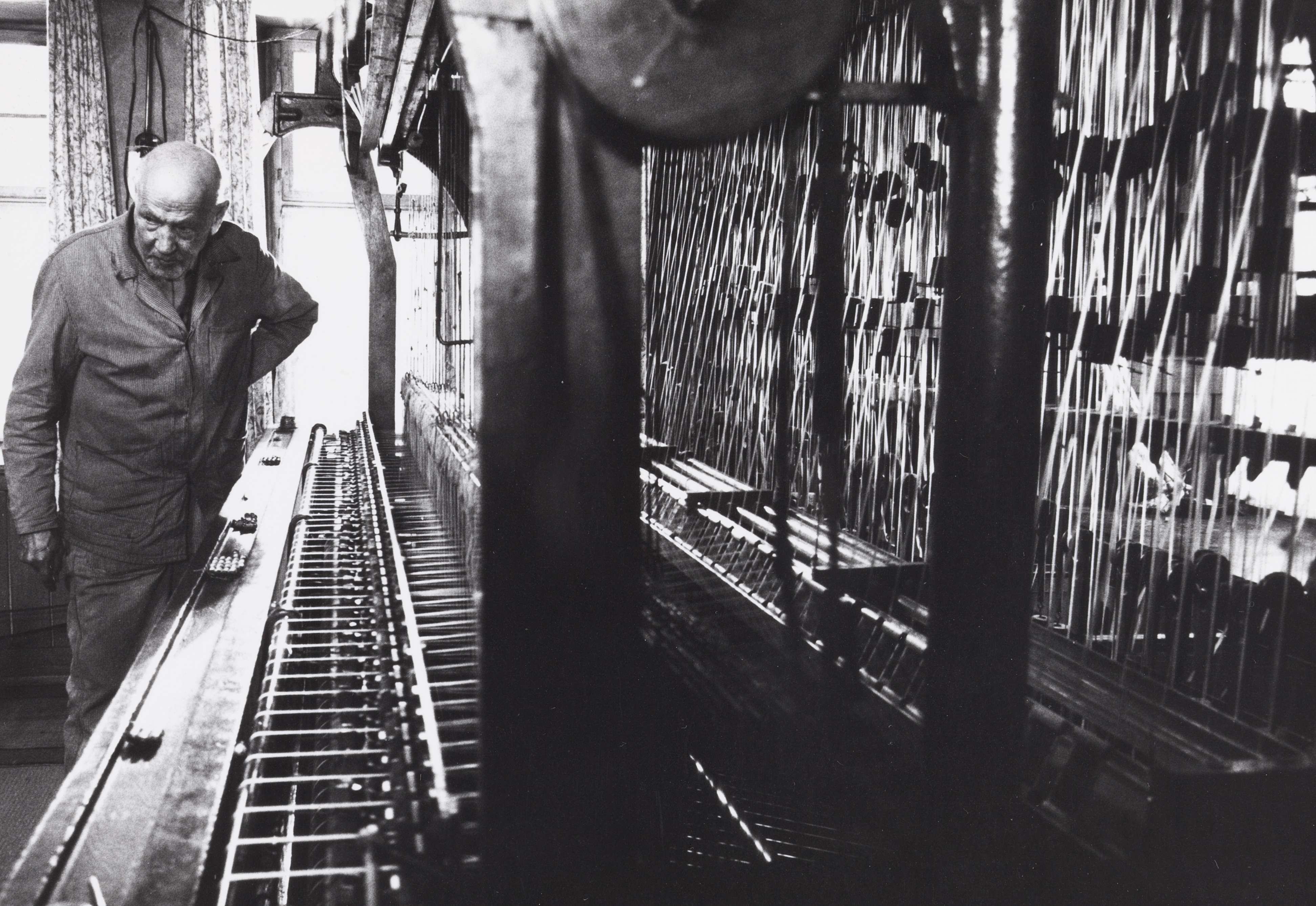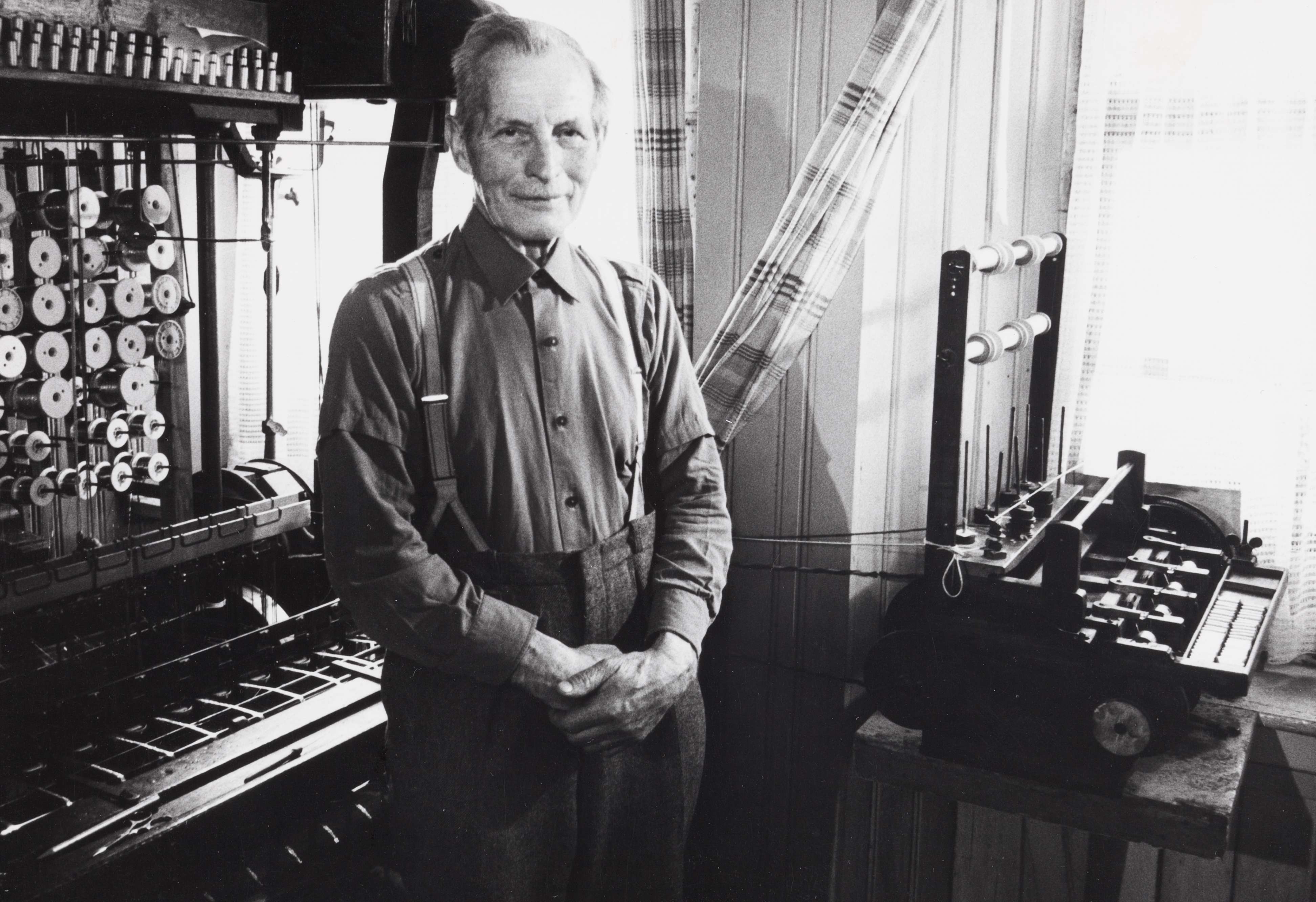 SGV_01P_02820Ernst Walliser bei der Kontrolle einer Strange fertiger schmaler Bänder, die mit Querfäden gesichert ist. Vor dem Ofen Bändelhaspel und Bändelkarton. Reigoldwil 1973.