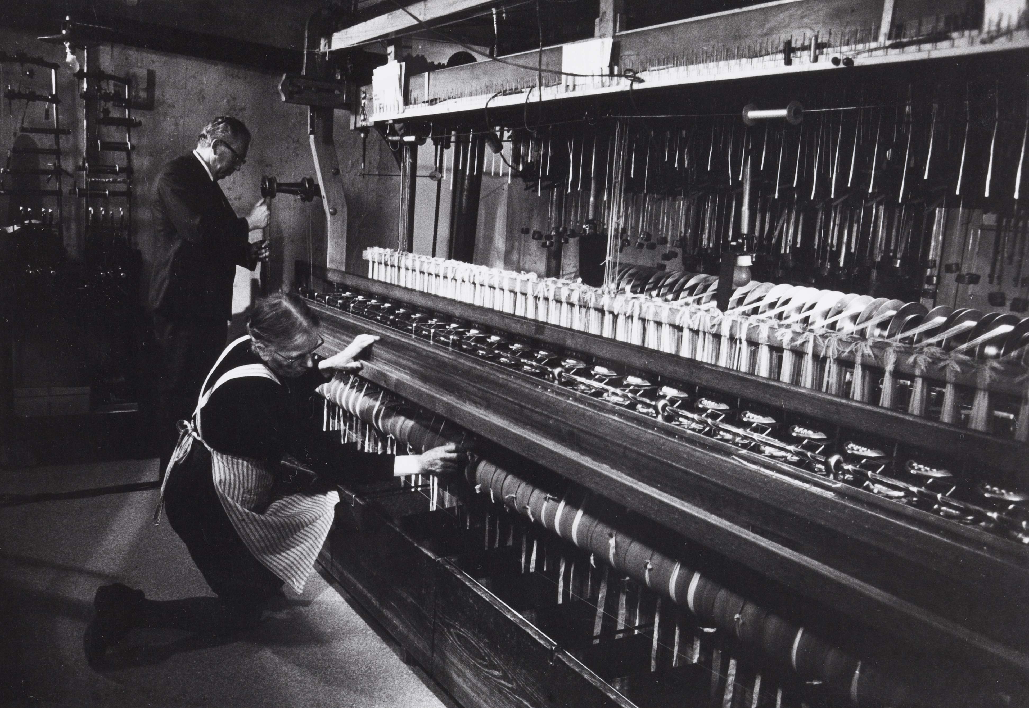 SGV_01P_02823Posamentstuhl mit breiten Bändern (4 Gänge); die Weberin beim Flicken eines zerrissenen Zettelfadens. Hinten über den Schäften die metallenen Zettelrollen, vorne die fertigen Bänder. Rünenberg 1973.