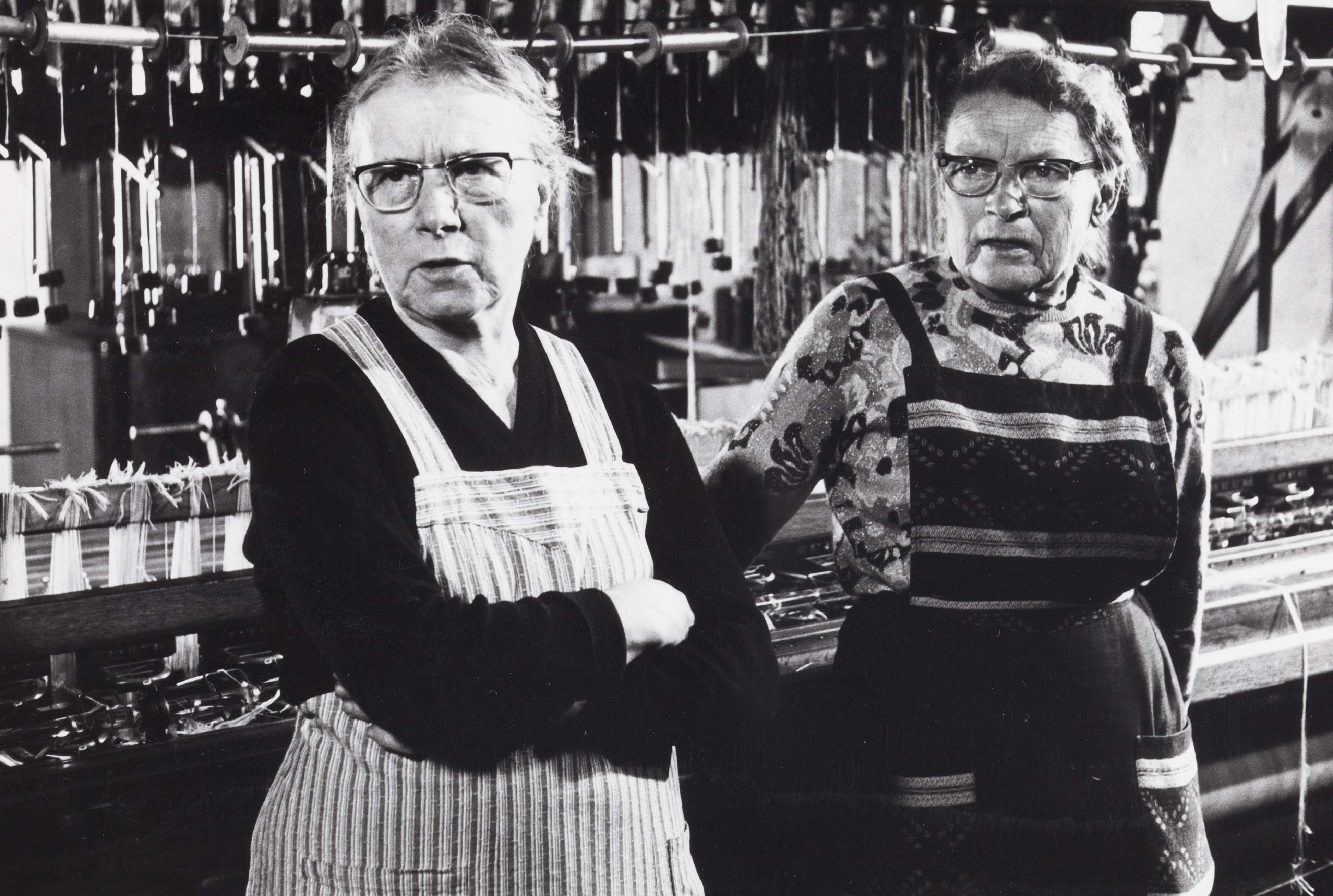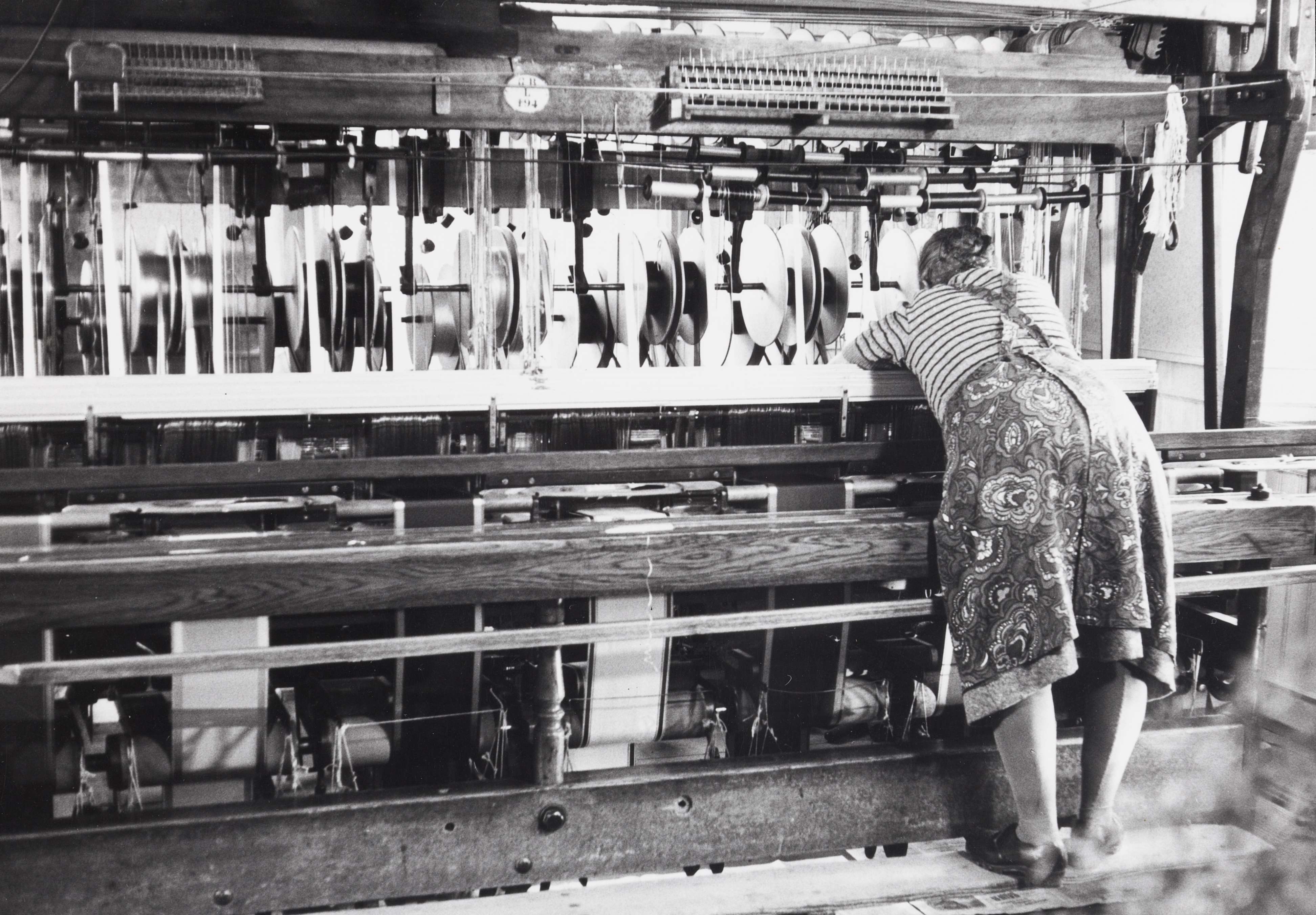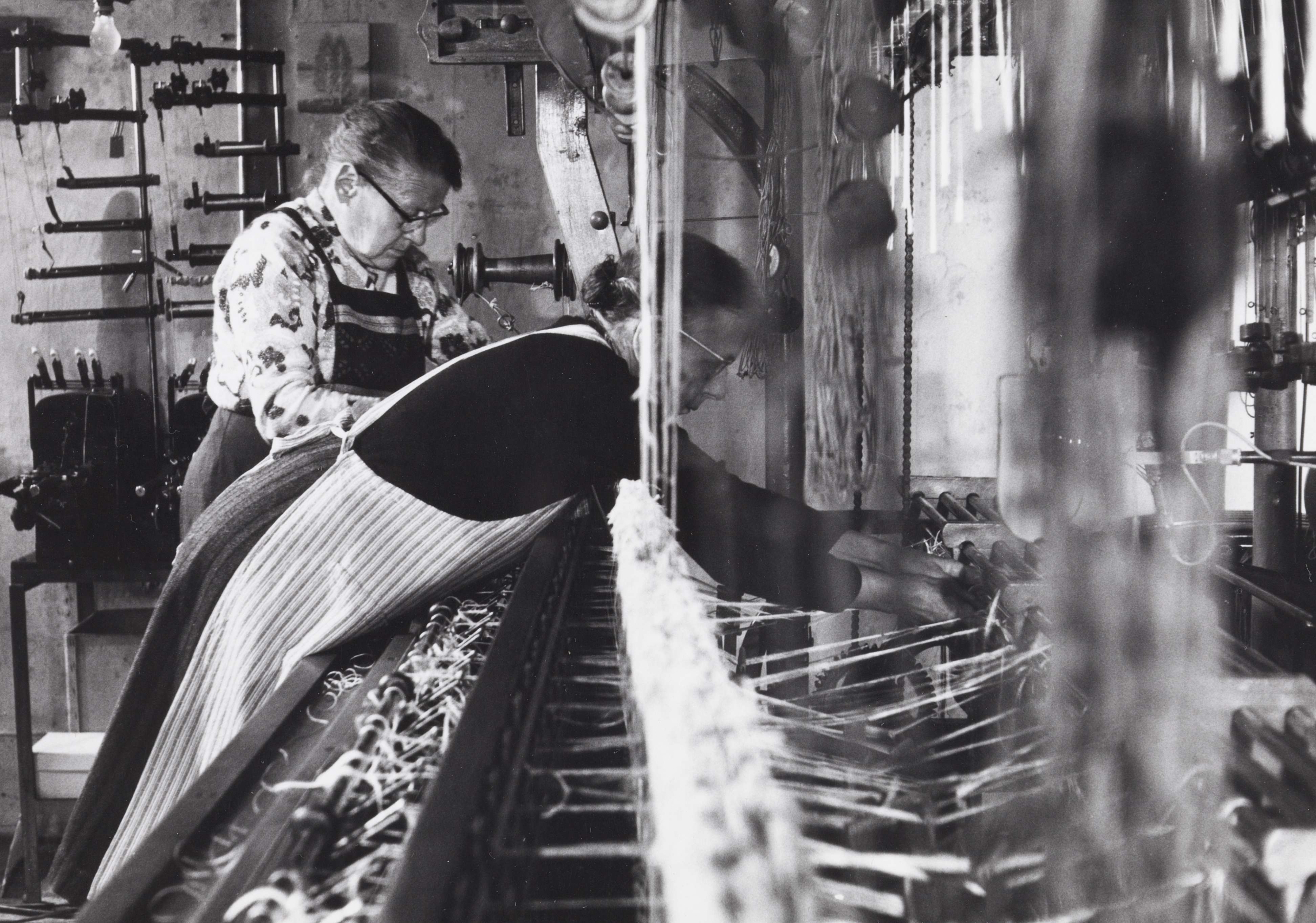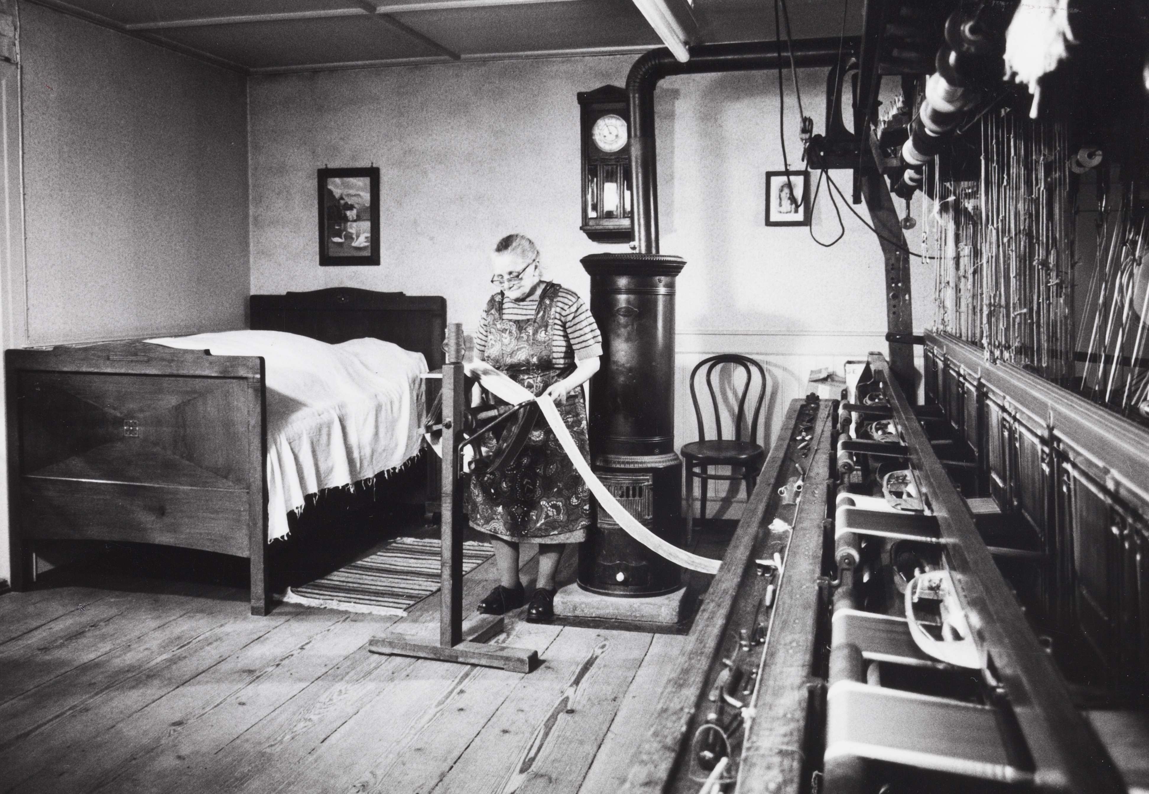 SGV_01P_02821Martha Buser beim Abhaspeln der fertigen Bänder (für Schleifen an Grabkränzen) Man beachte die grossen Schiffchen des Posamentstuhles
