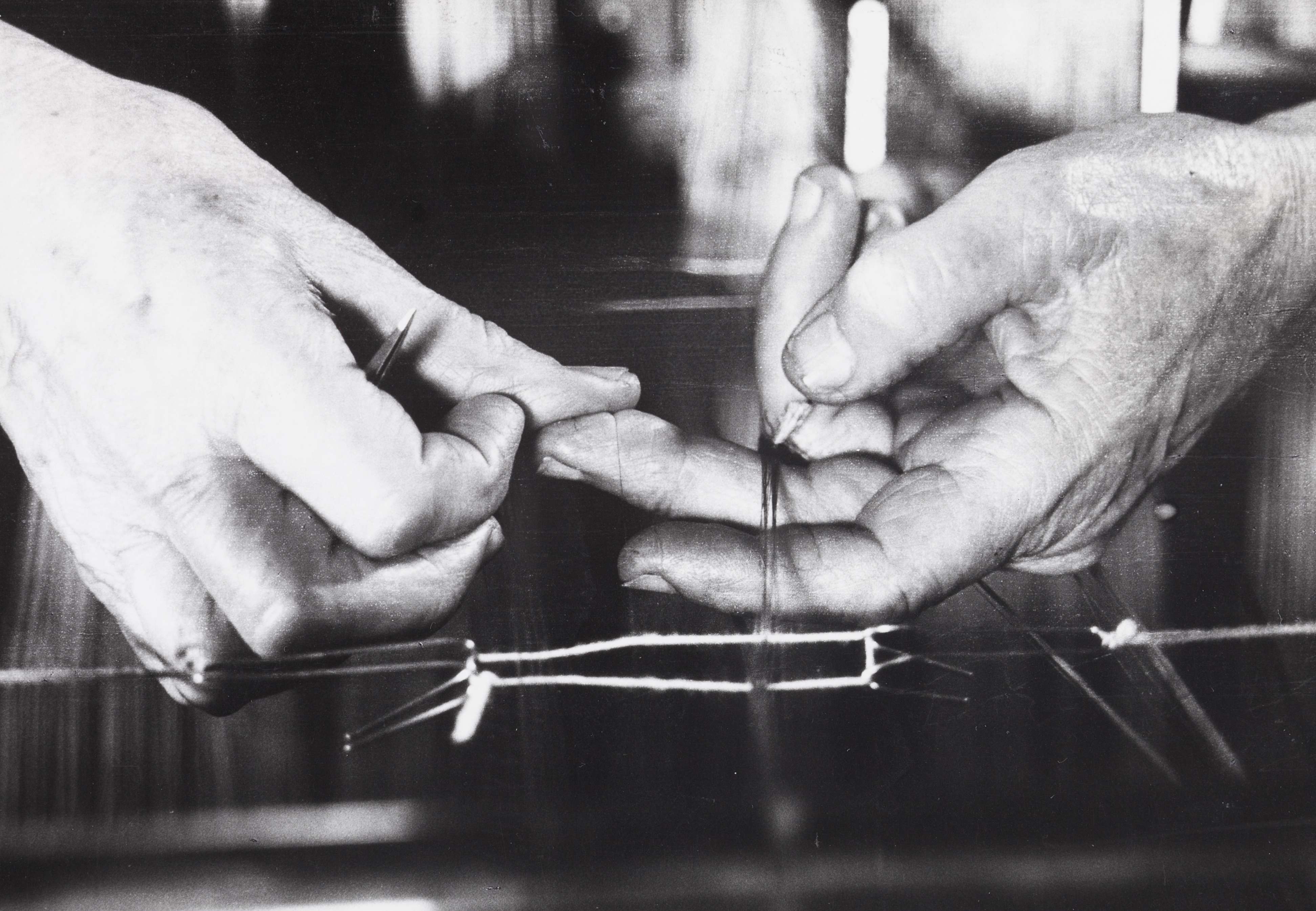 SGV_01P_02829Detailaufnahme: in das Rischpi schlagen, d.h. Verknüpfen des Zettelfadens der neuen mit demjenigen der alten Rechnung. 17 000 bis 18 000 einzelne Fäden, Arbeit zu zweien für zwei Tage. Rünenberg 1973.