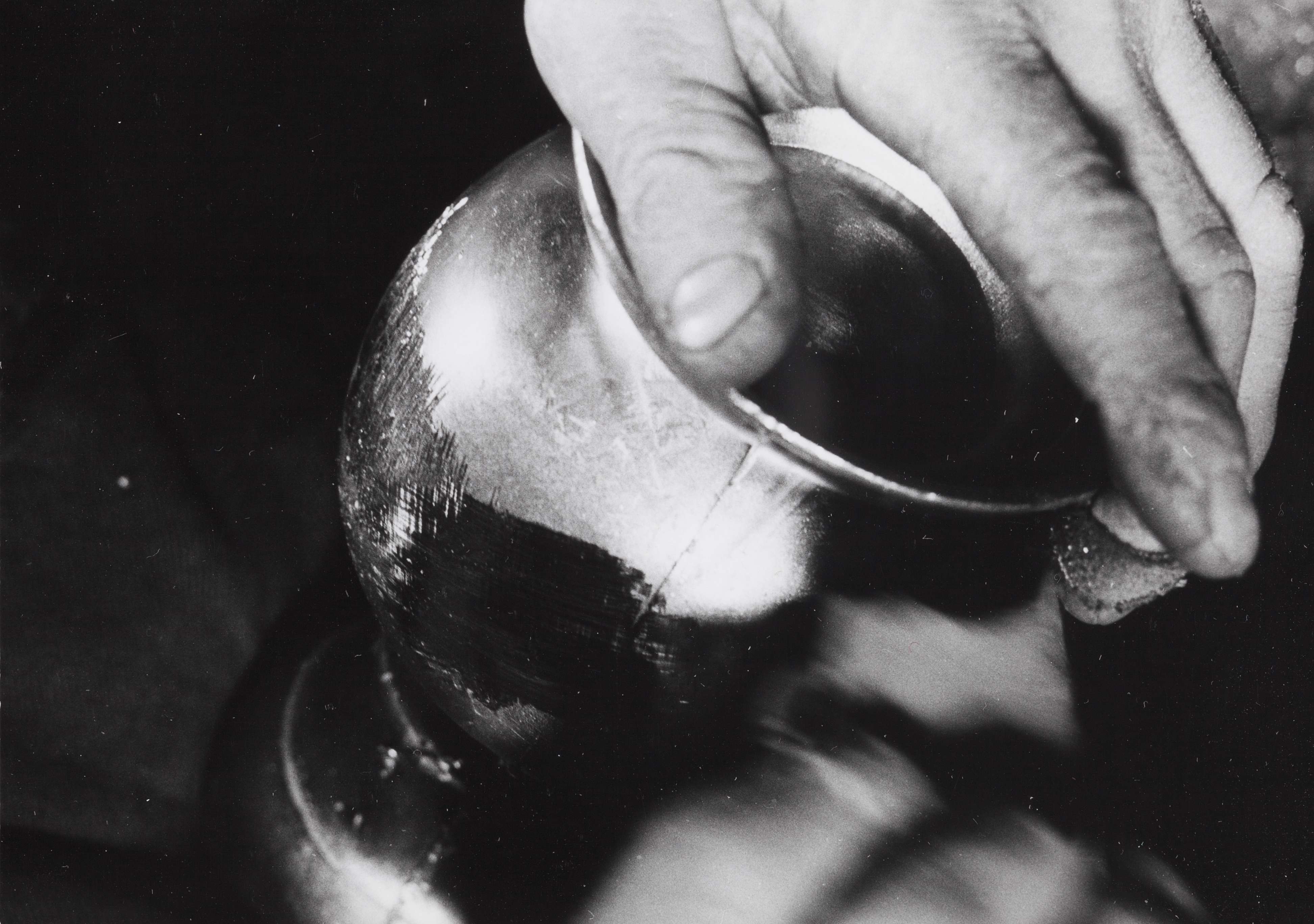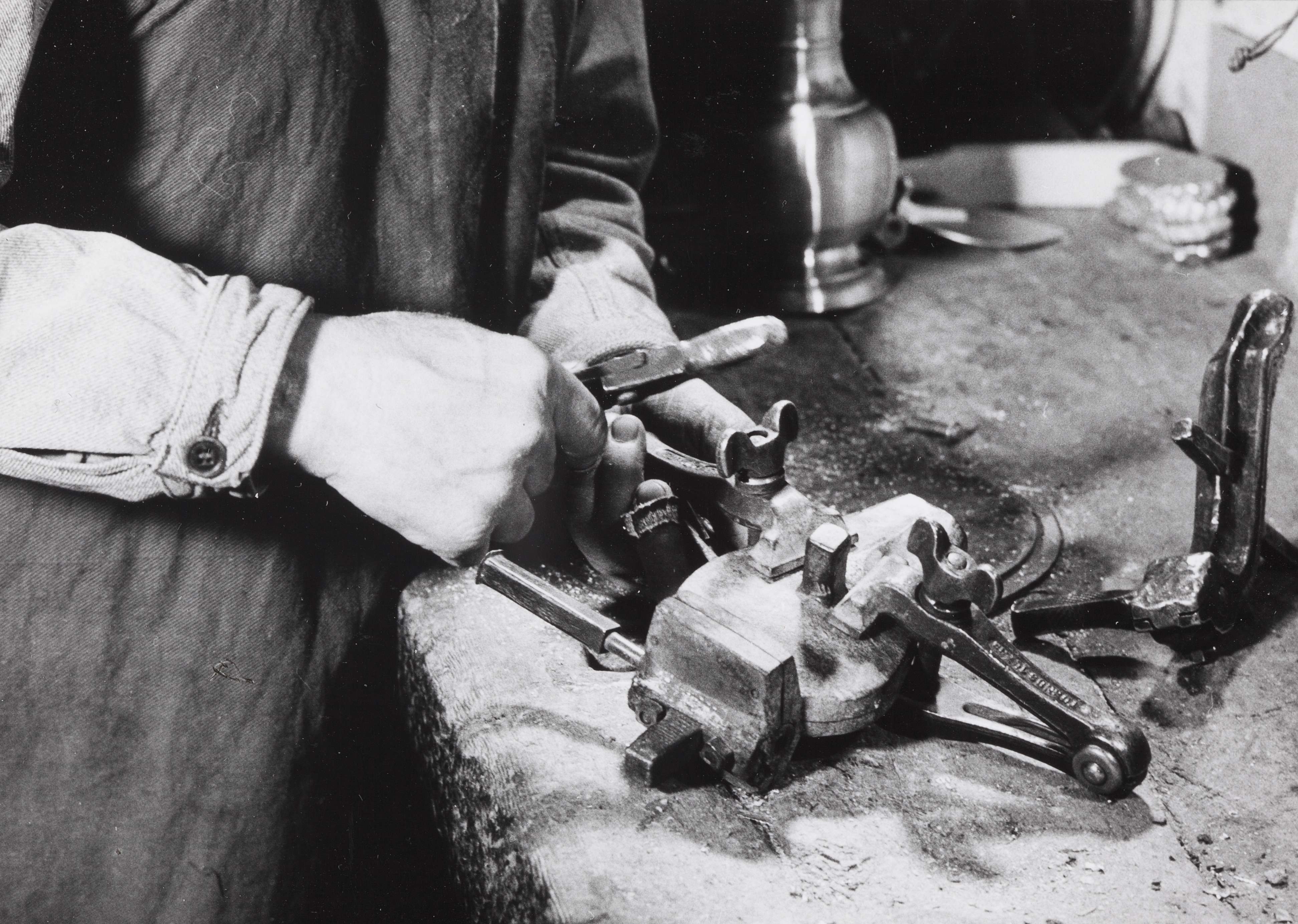 SGV_01P_0144747. u. 48. Della Bianca lötet den Henkel hinten am Kannenkopf und Kannenhals an. Der Ausguss wird mit einem Holzhammer nach Augenmass gehämmert. - Die Kanne wird poliert.