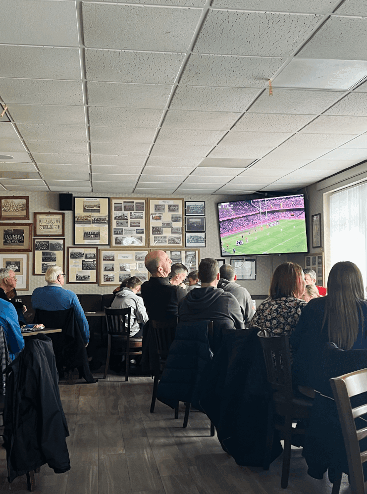 Wir betraten also das Clubhaus, in dem sich auf der einen Seite eine Bar befand und auf der anderen Seite Bankreihen, Tische und Stühle reihten. An den Wänden hingen Mannschaftsfotos und Plaketten, die zig Jahre zurückdatiert waren, und eine Wand war durch eine imposante Sammlung von Trikots verdeckt. Die Atmosphäre erweckte nicht, wie man sich das vielleicht für britische Pubs gerne vorstellt, «a warm fuzzy feeling», vielleicht mit Kamin und schönen Holzverzierungen. Das Clubhaus ist eher pragmatisch ausgestattet mit Laminatboden und einer industriell wirkenden Deckenverkleidung, bei der einige Panels fehlen. Ich brauchte nicht lange, um herauszufinden, wer die ‹Alteingesessenen› waren. Sie waren alle an der am besten gelegenen Tischreihe entlang der Fensterfront in Nähe des Notausgangs (für eine schnelle Zigarette zwischendurch) versammelt.