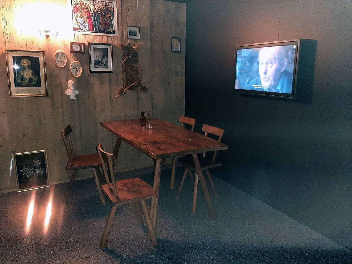 Überhaupt bleiben die erzählenden Menschen neben den Sammlern und Literaten – freilich auch quellenbedingt – etwas konturlos. Dabei hätte hier gerade die berühmte Sammlung des Altdorfer Spitalpfarrers Josef Müller (1870–1929), die leider nur in einem flächig dekorativen Faksimile einer Aufzeichnung «Einen Tunsch […]» präsent ist, reichlich Material und Möglichkeiten geboten. Immerhin begegnet man dann den Menschen noch in einem als merkwürdig stimmungsvolle Stube eingerichteten Videoraum. An Ausschnitten aus dem Kinofilm Arme Seelen (Edwin Beeler, 2011) lässt sich etwas von der noch gar nicht so lange zurückliegenden Präsenz der Erzählstoffe und Vorstellungswelten im Alltag der alpinen Bevölkerung erahnen. Uralte Sagenstoffe werden da erzählt, als wären sie gestern erlebt worden – ein wichtiges Prinzip, das hier auch ohne weitere Erklärungen erkennbar wird.