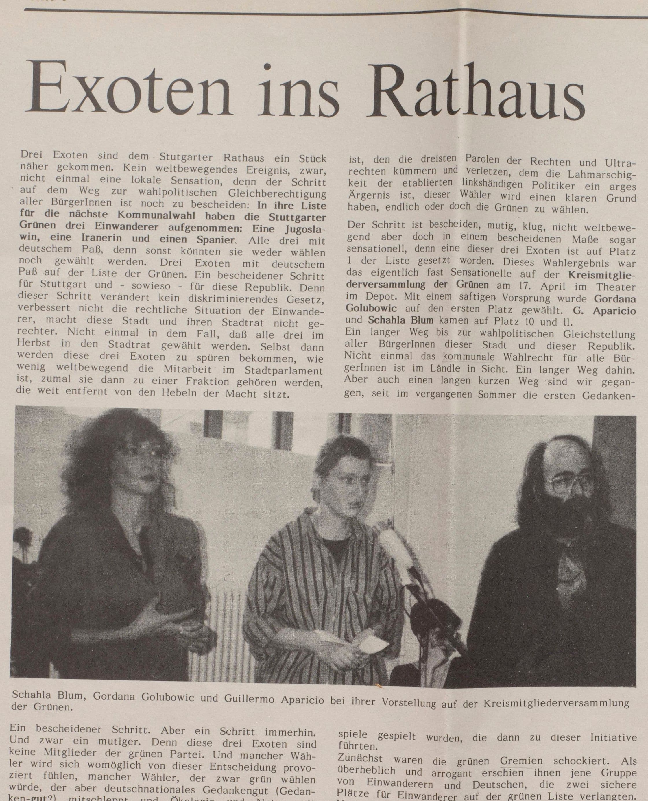 Zum anderen hat die Initiative, um tatsächlich Chancen auf Plätze im Gemeinderat zu haben, bei der Partei Die Grünen angeklopft, die schon früh das allgemeine und kommunale Wahlrecht gefordert hatte.[vii] Nach anfänglichen Konflikten traten schliesslich vier Vertreter:innen der EinwanderInnen auf der Grünen Liste bei der Wahl im Jahr 1989 an, auch ohne der Partei beigetreten zu sein.[viii] Zwei von ihnen kamen in den Gemeinderat; die 44-jährige Diplomingenieurin und Malerin Shahla Blum sogar als «Stimmkönigin» der Grünen.[ix] Dieses Ergebnis verweist auf die erfolgreiche Öffentlichkeitsarbeit der Wählerinitiative, aber auch darauf, dass es in dieser Zeit eine breite soziale Basis für ihre radikalen einwanderungspolitischen Forderungen in Stuttgart gab. Gleichzeitig gelang allerdings auch den Republikanern ein Erdrutschsieg mit 9.5 Prozent der Stimmen und sechs Sitzen im Gemeinderat.