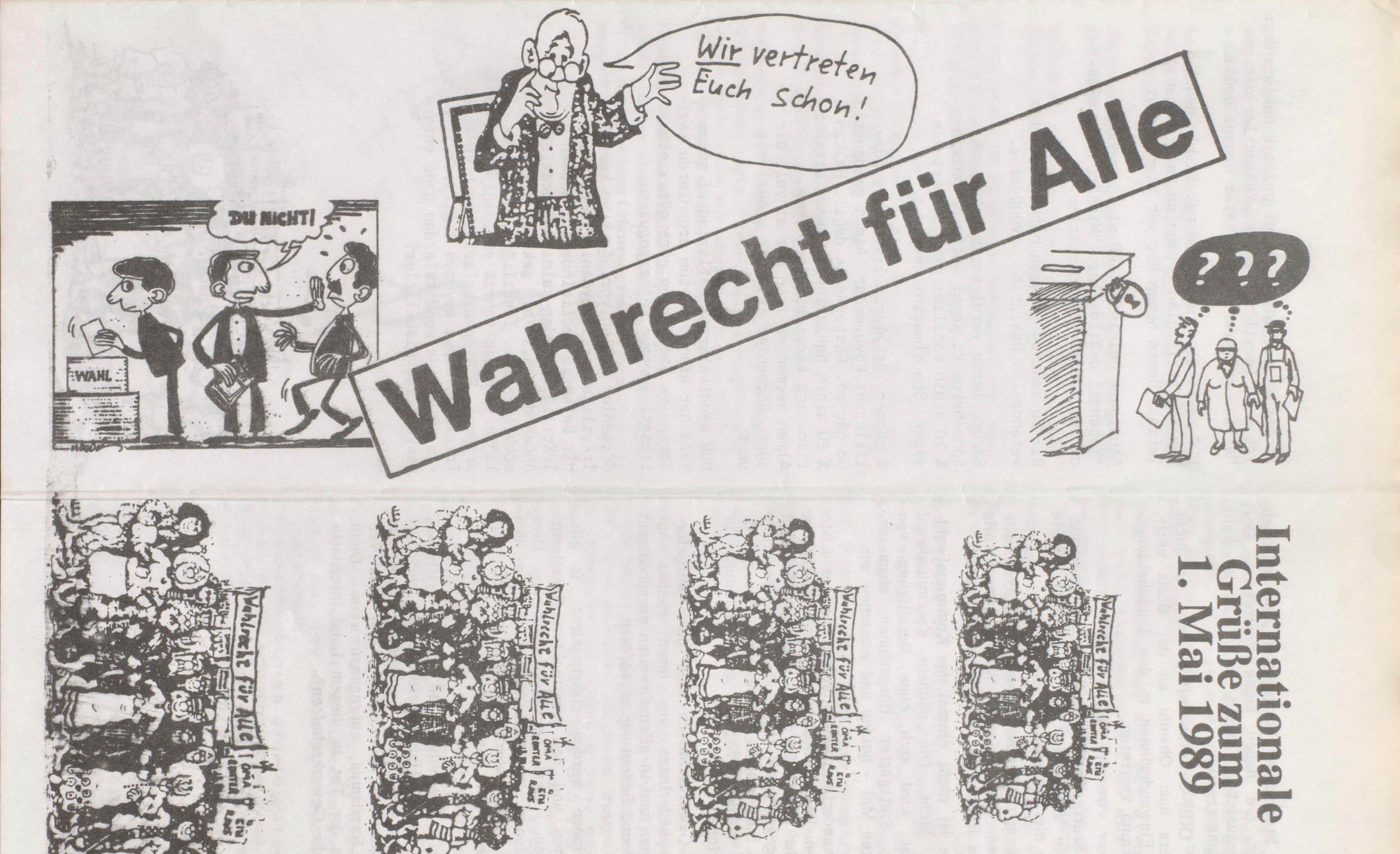 Lisa Riedner, Sabine Hess, Wahlrecht für alle! Die antirassistische Bürgerrechtsbewegung der 1980er in Deutschland, in: das.bulletin, 01.04.2026, URL: https://ekws.ch/de/bulletin/post/wahlrecht-fuer-alle-die-antirassistische-buergerrechtsbewegung-der-1980er-in-deutschland.